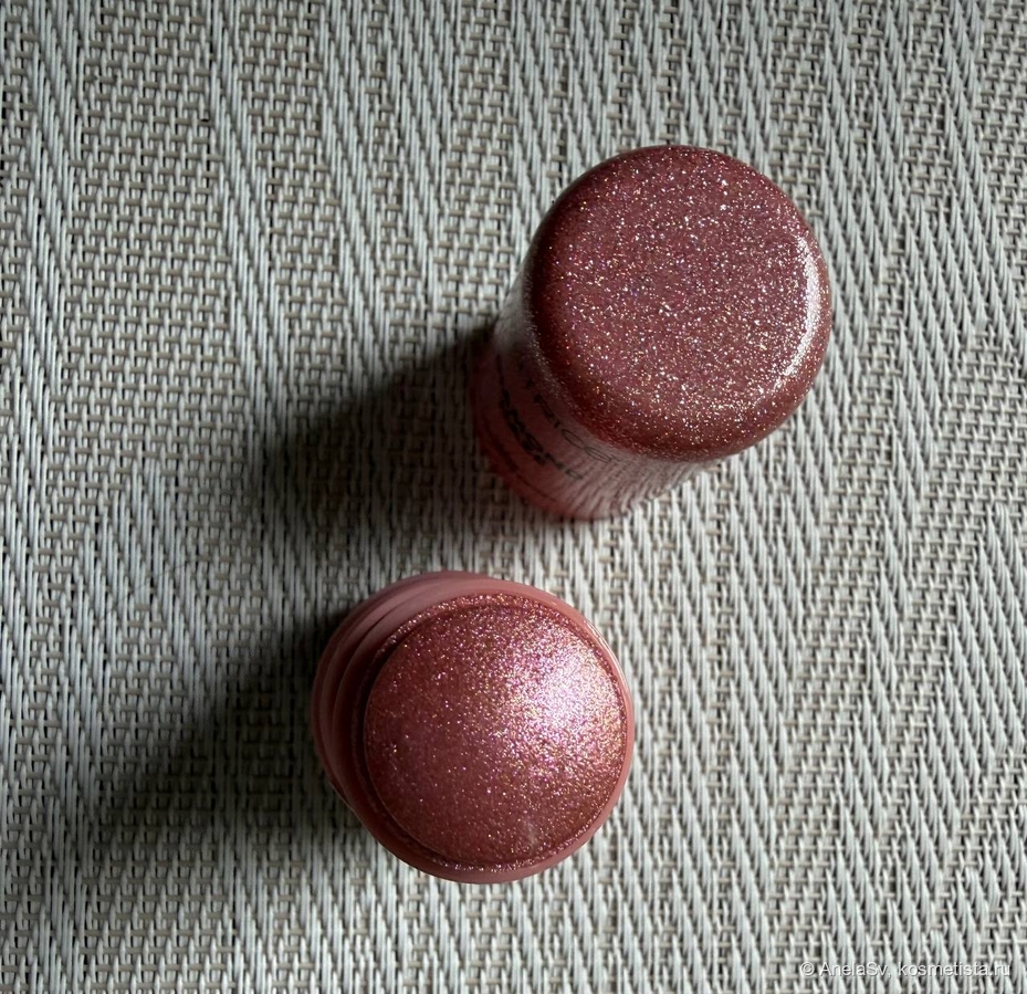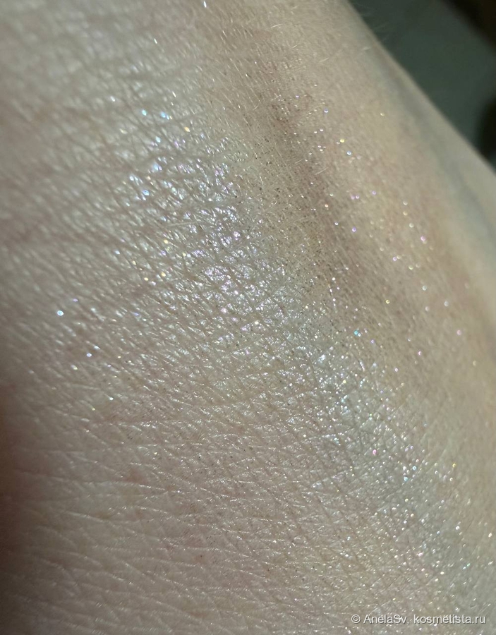 Внешний вид очень красивый — хайлайтер выглядит сочно и глянцево, со множеством отдельных шиммерных частиц, переливающихся из золотого в розовый и сиреневый.