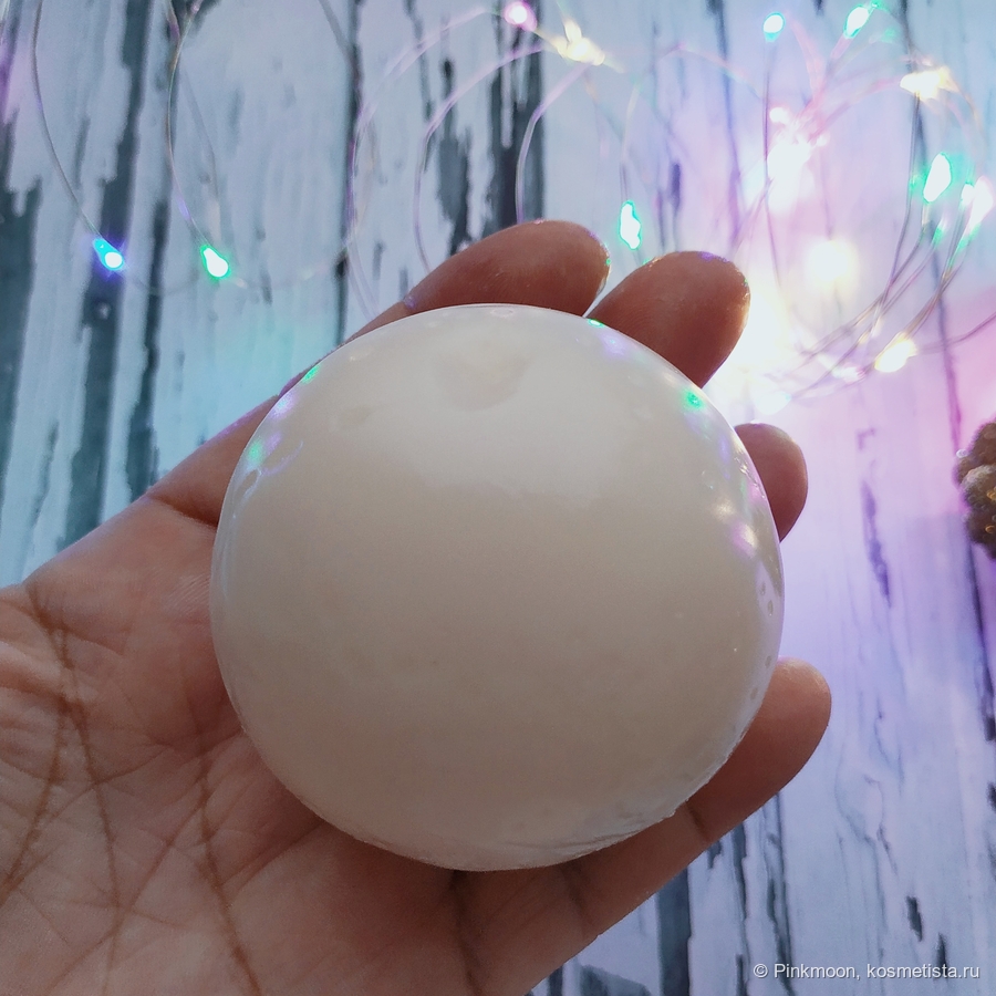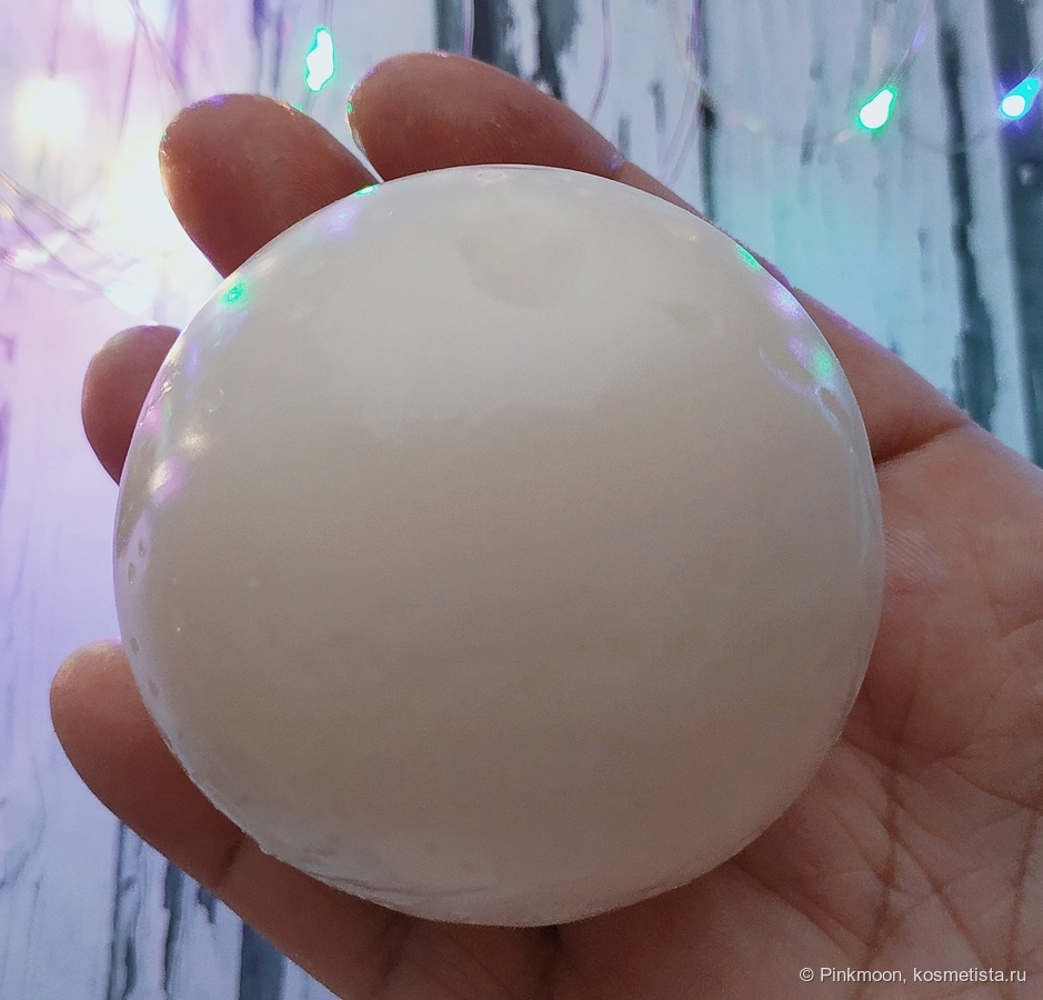 Сам шар белого цвета, довольно круглый, гладкий и упругий. Запаха почти нет, во всяком случае я его практически не чувствую.
