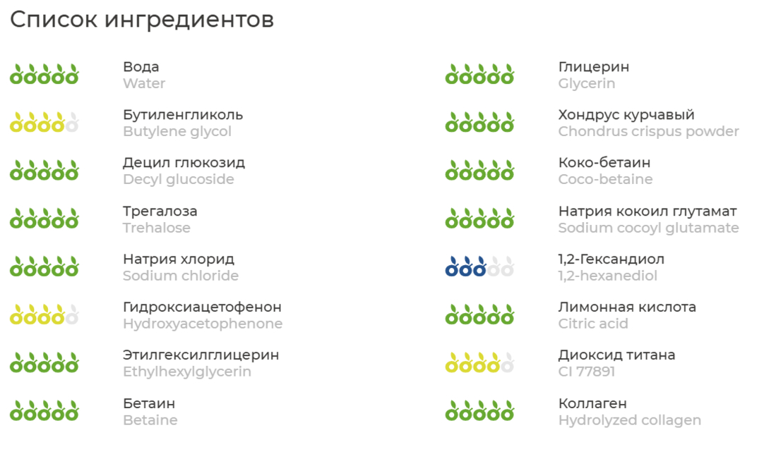 Состав, как мне кажется, очень хороший: Water, Glycerin, Butylene glycol, Chondrus crispus powder, Decyl glucoside, Coco-betaine, Trehalose, Sodium cocoyl glutamate, Sodium chloride, 1,2-hexanediol, Hydroxyacetophenone, Citric acid, Ethylhexylglycerin, CI 77891, Betaine, Hydrolyzed collagen.