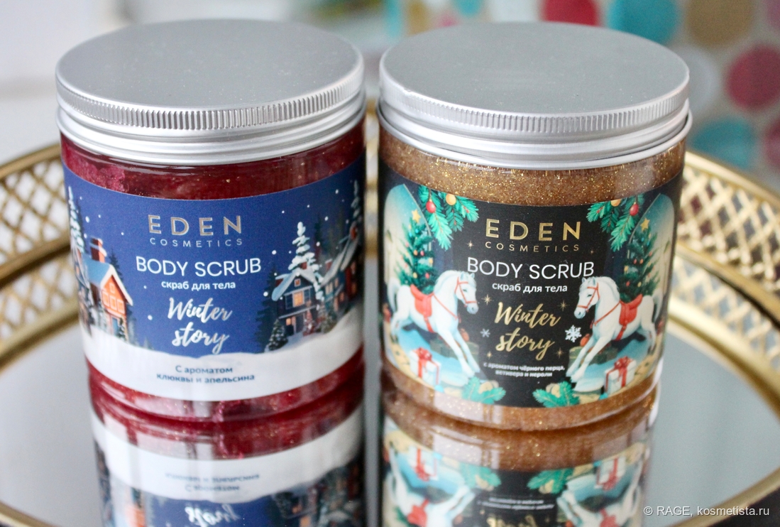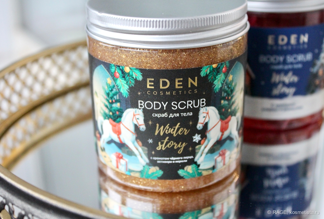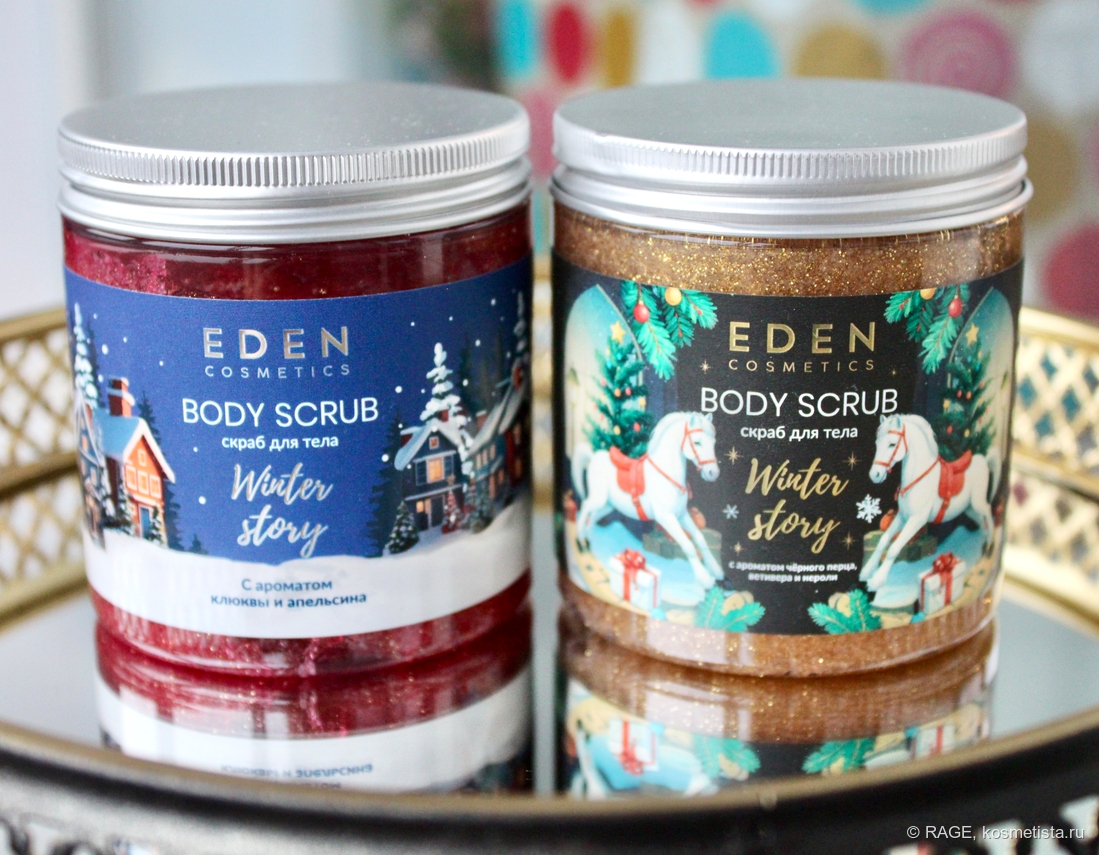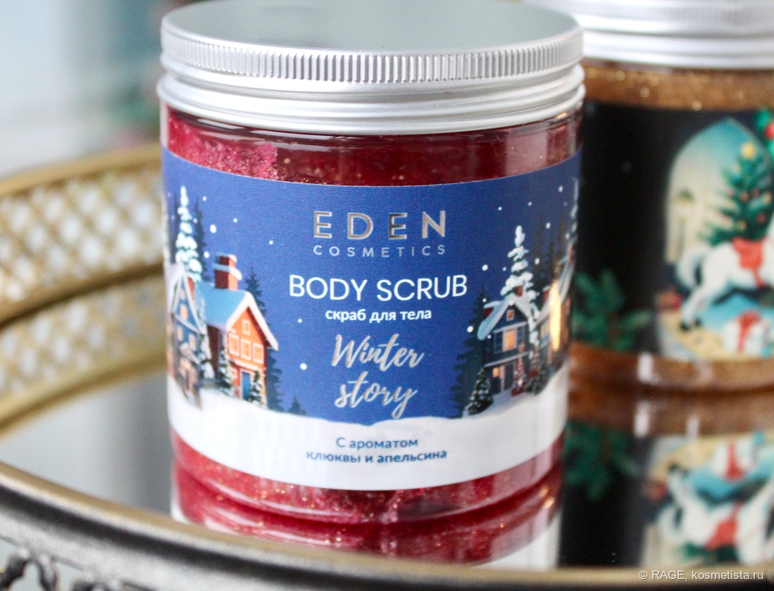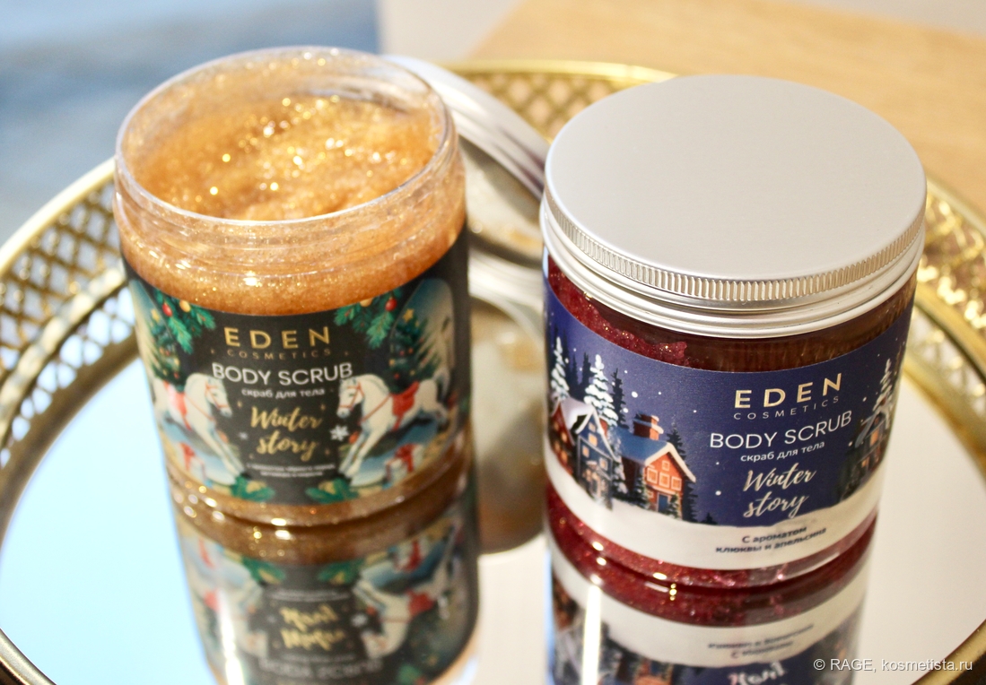 У Eden Cosmetics есть неплохой ассортимент уходовой косметики для тела с «рождественскими» ароматами (кремы для рук, лосьоны для тела, жидкое мыло, гели для душа), и в этом году бренд выпустил ещё и антицеллюлитные скрабы для тела.