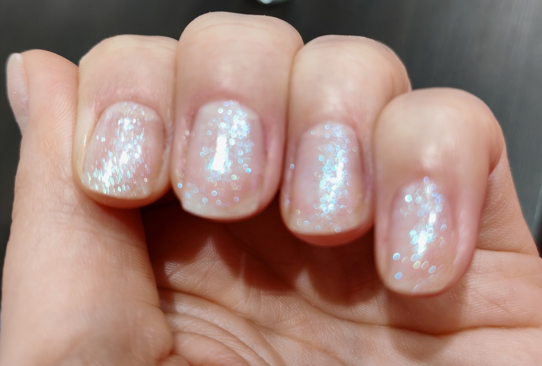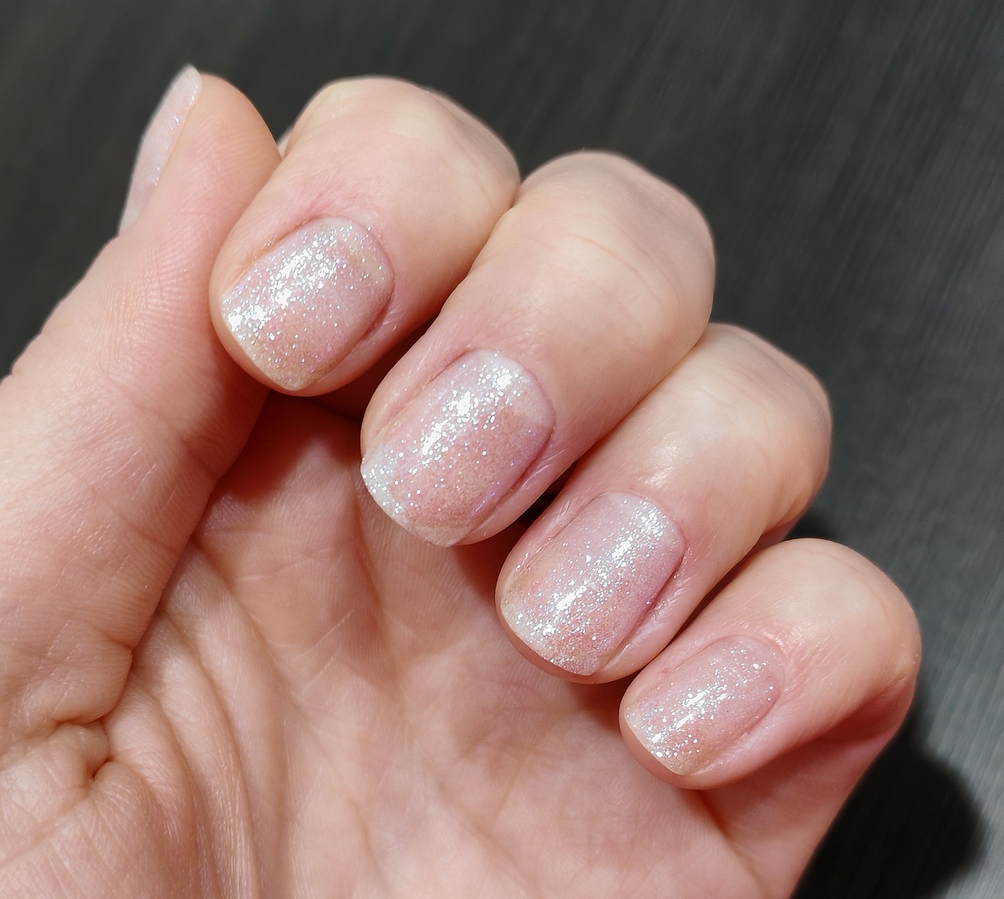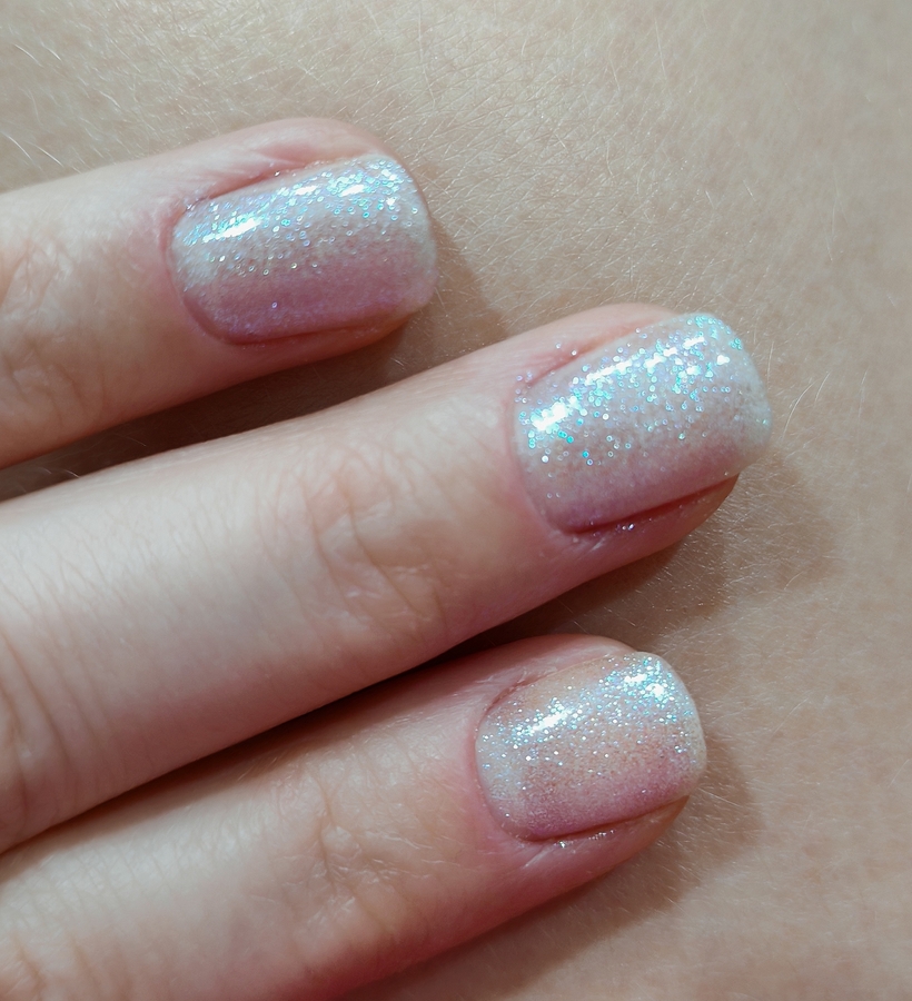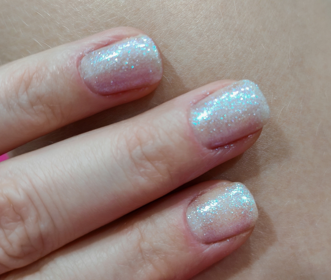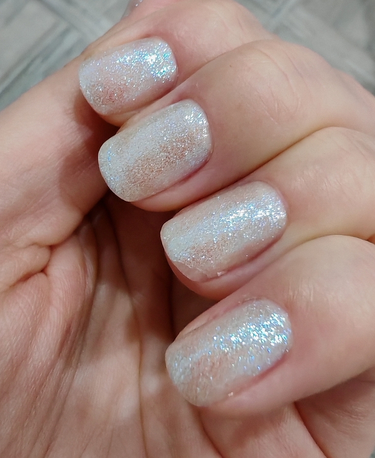 Оттенок представляет из себя россыпь блесток на полупрозрачной базе.