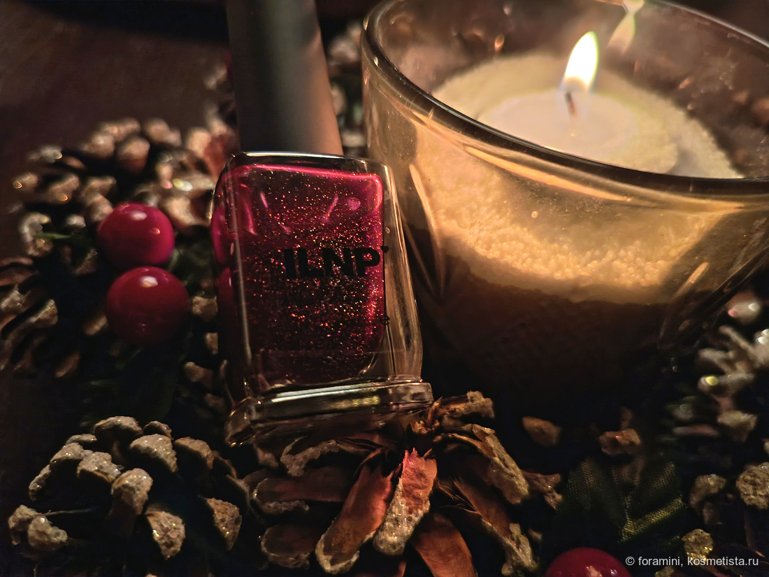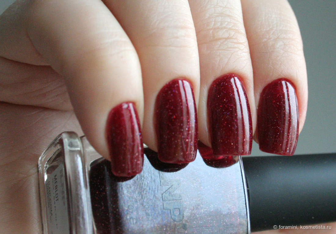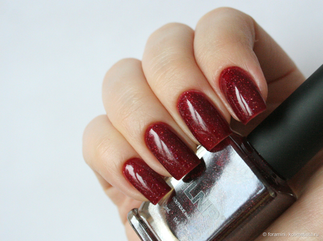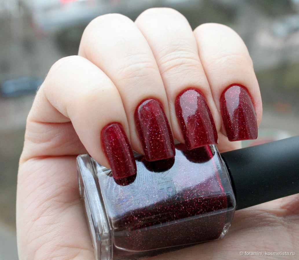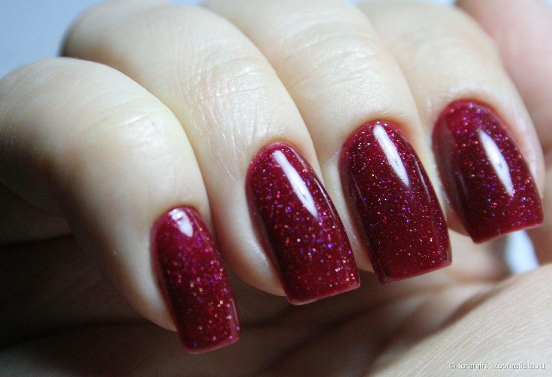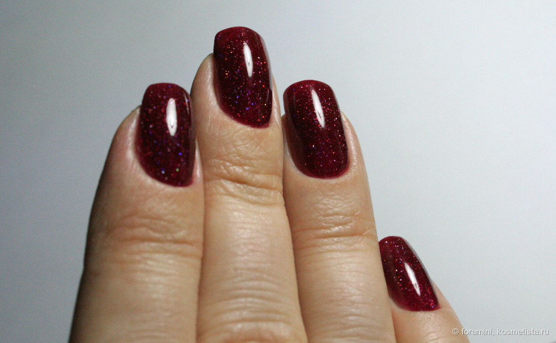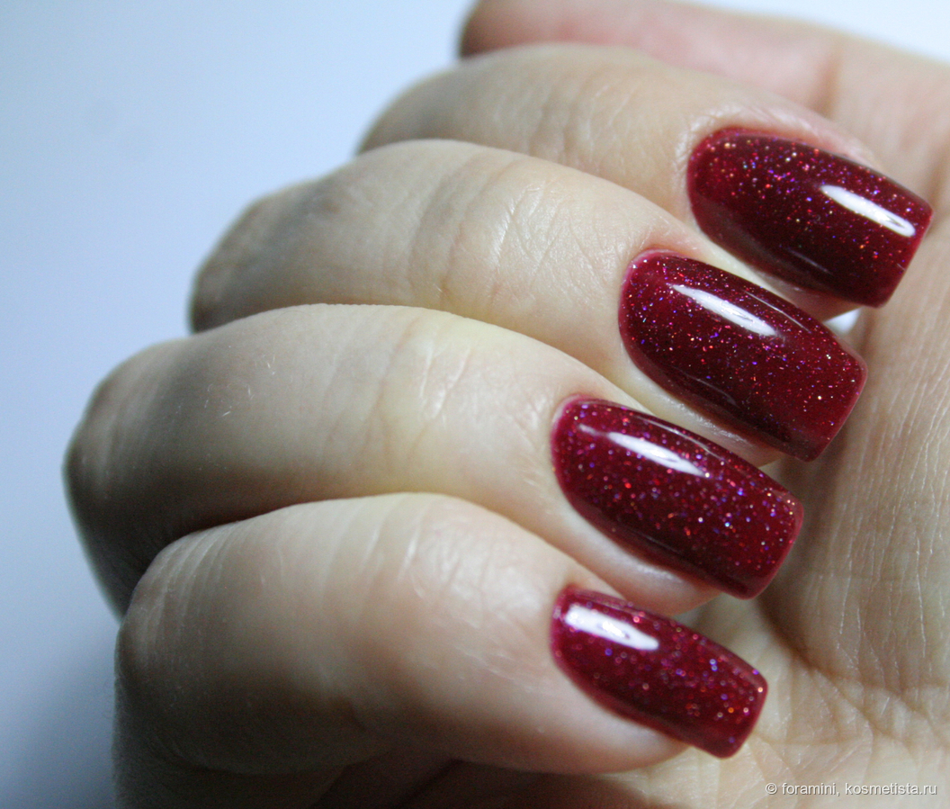 Это бордовое желе с россыпью голографических искорок. В два слоя имеет более ягодный оттенок, в три слоя приобретает глубину, голография тоже поблескивает ярче в три слоя.