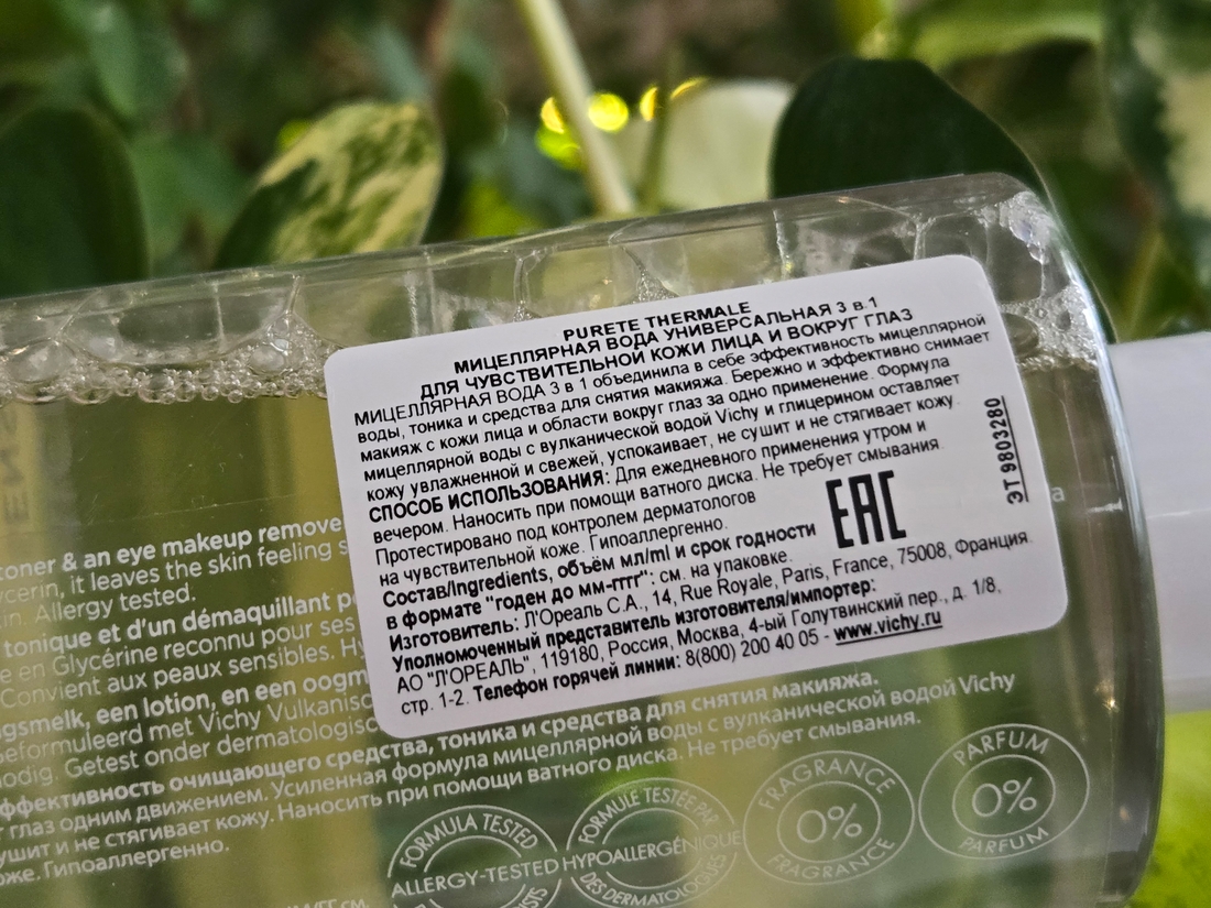 На стикере уже всё более подробно и на русском. Мицеллярная вода разработана специально для чувствительной кожи, гипоаллергенна. В составе нет спирта, парабенов и отдушек. Она протестирована под дерматологическим и офтальмологическим контролем. Вода объеденила в себе ээфективность мицеллярки, тоника и средства для снятия макияжа.