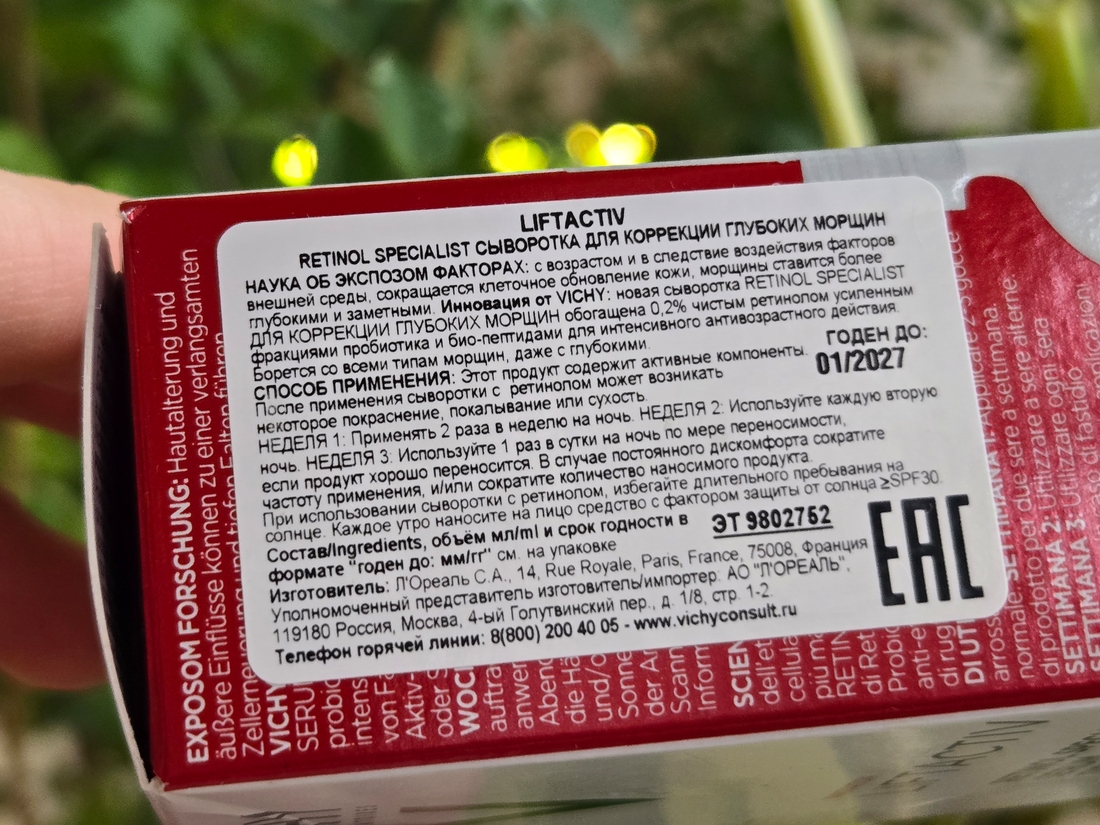 На стикере приклеенном сверху есть подробная информация на русском языке. Сыворотка гипоаллергенная, протестирована под контролем дерматологов. Ретинол в её составе ускоряет клеточное обновление, повышает плотность и упругость кожи, активирует процессы восстановления.