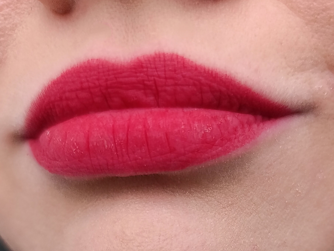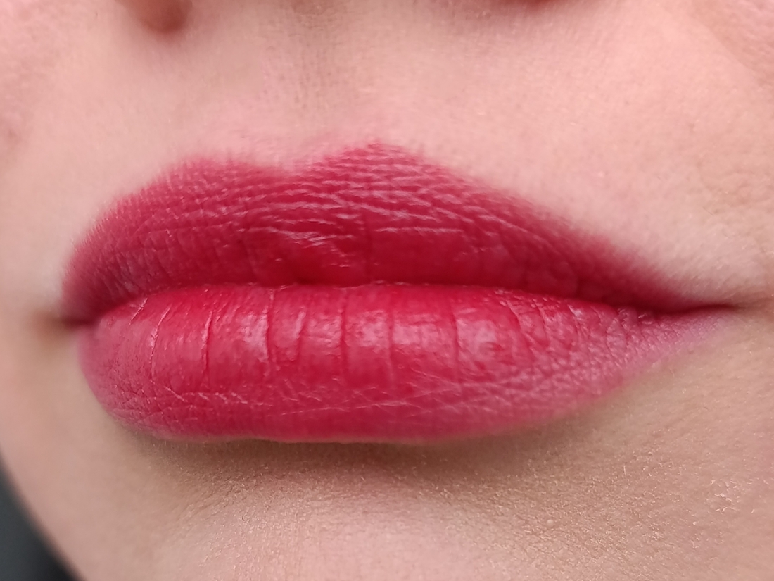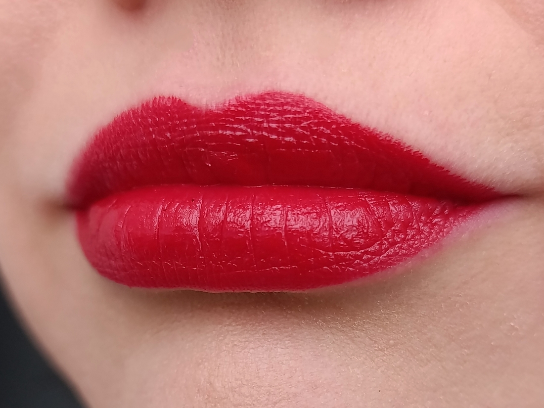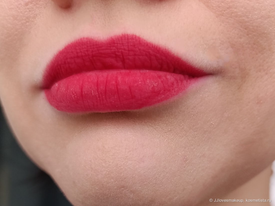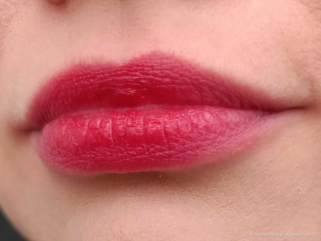 Плотность/прозрачность: цвет плотный, перекрывает пигмент губ, при этом хорошо растягивается в дымку и тушуется.