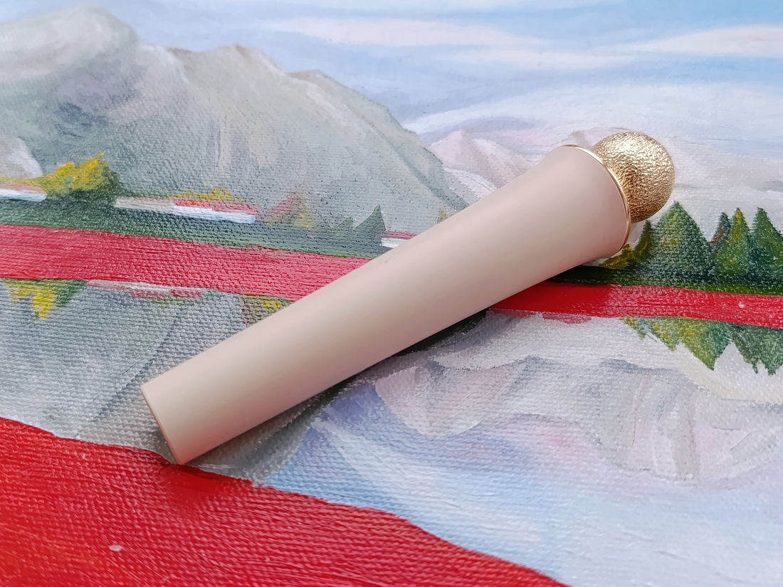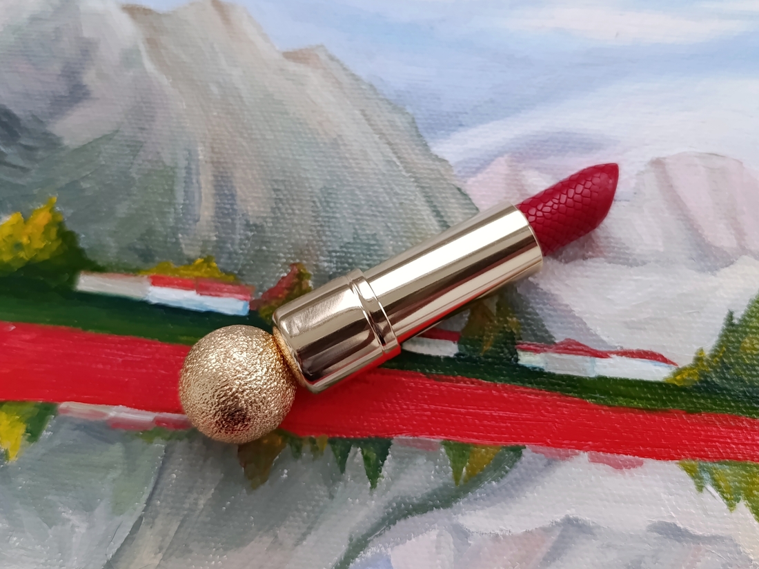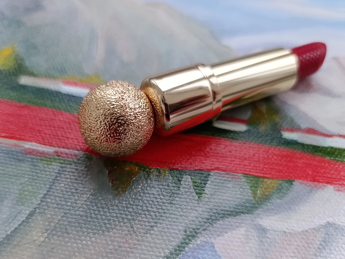 Стик полностью в золотом обрамлении, на кончике цоколя помады красуется большой золотой шарик, за него можно вытягивать помаду, а можно просто поглаживать и приговаривать «Моя прелесть».