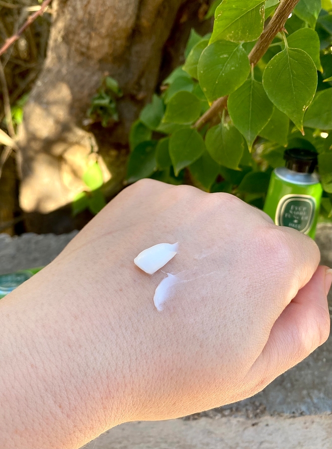 Консистенция — средней плотности. Он легко разносится, покрывает кожу лёгкой плёночкой, которая помогает хорошо увлажнить кожу рук. Крем имеет небольшой объём и на тело я его наносить не пробовала, но абсолютно уверена, что он справился бы отлично, при необходимости.