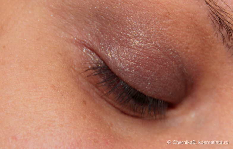 Этот оттенок очень пигментированный, может делать веки значительно темнее. На солнце он красиво переливается, но сегодня очень пасмурный день. Я наносила его едва касаясь век. Мне нужен был лёгкий тон, а не тёмный. Толстой кисточкой я нанесла его по веку и немного выделила пространство на нижнем веке.
