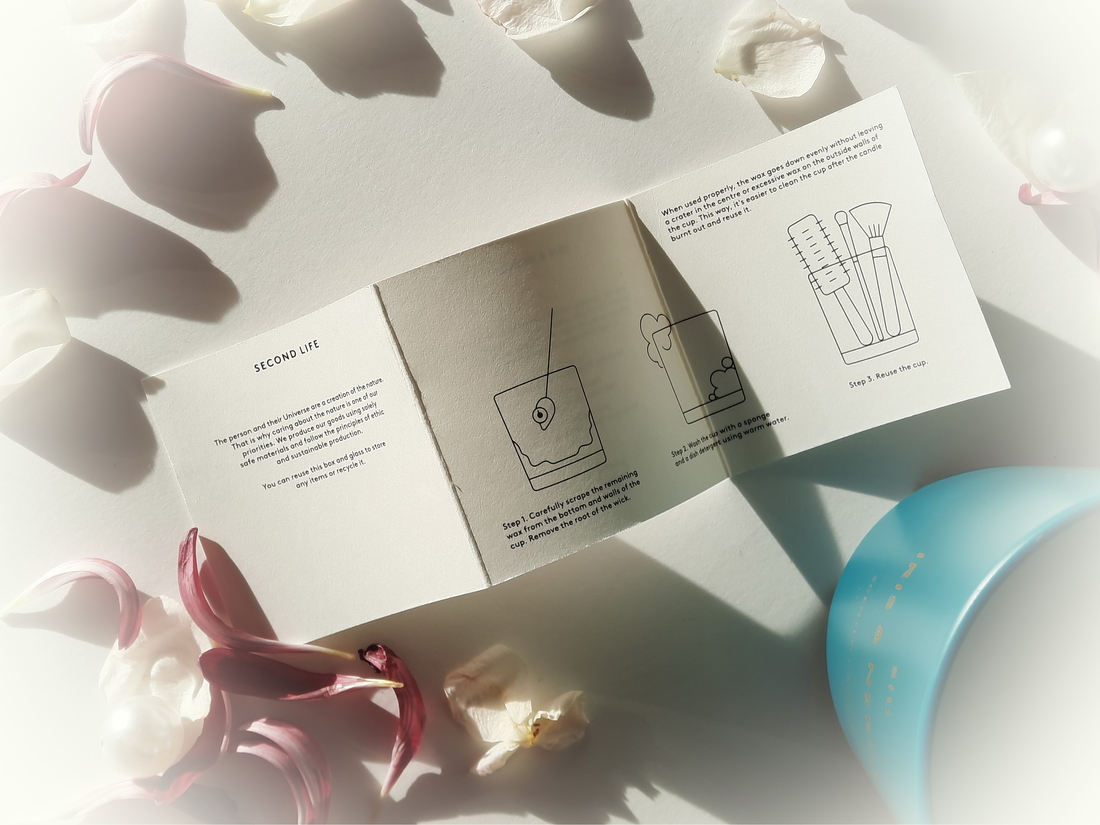 В футляре было вложение, на котором информация: название свечи и описание, немного о бренде, пирамида аромата, а на другой стороне — как можно использовать подсвечник после того, как воск закончится.