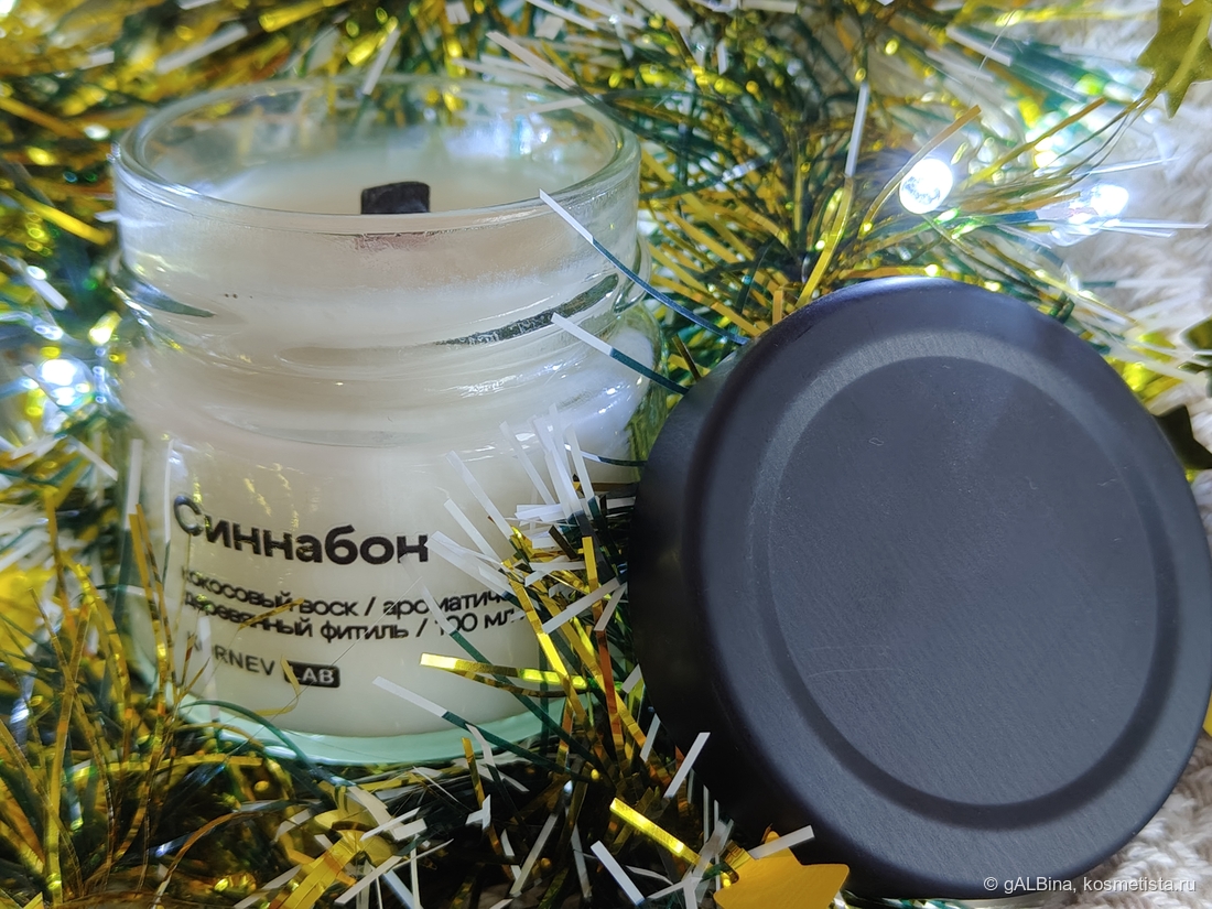 Свеча сама по себе небольшая, на мой взгляд всё симпатично: стеклянная банка и жестяная крышка. Объём 100 мл. Сделана из кокосового воска, я случайно пролила на руку после того, как свеча прогорела и на ощупь довольно приятная маслянистая текстура, которая отлично увлажняет. По инструкции им даже можно делать массаж. Плавится равномерно, сохраняет оттенок и после застывания не желтеет. Оставляет приятный аромат после использования. Фитиль у неё деревянный. При горении издаёт приятный звук пламени.