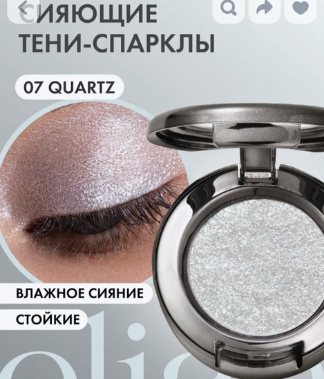 Спаркл очень красиво сияет, его можно использовать как соло, так и в качестве топера поверх матовых теней. Или поверх кремовых матовых теней. Варианты зависят только от фантазии обоадательницы.