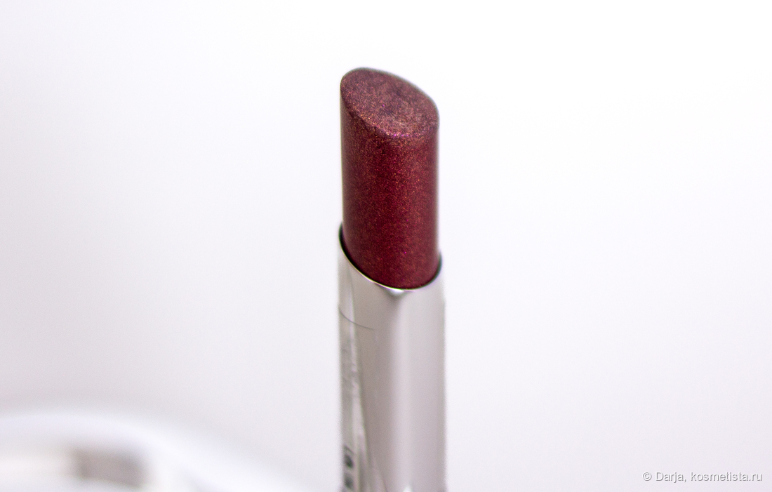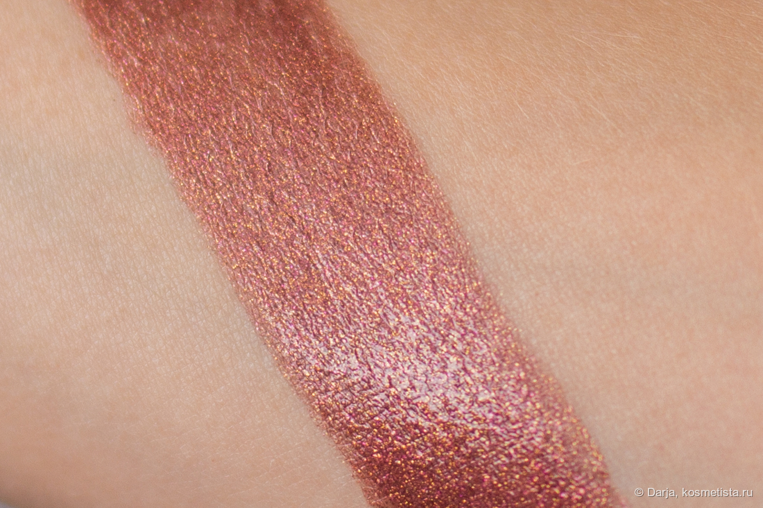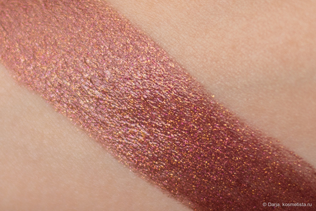 Текстура, как положено бальзамной помаде, пластичная и тающая на коже, но не слишком мягкая. При нанесении можно не беспокоиться о том, что стик помнётся. Шиммер не острый, не ощущается песком на губах. Глаз улавливает самые крупные частицы розового и золотого оттенка.