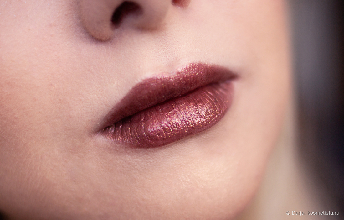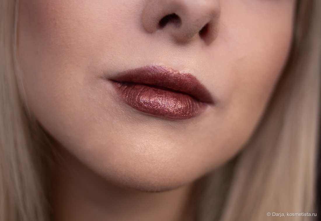 Так как помада бальзамная и тёмного оттенка, то не избежать хоть и минимального, но подчёркивания складочек и шелушений. На фото это бросается в глаза гораздо сильнее, чем в жизни. На общем плане и на фото заметить неровности покрытия почти невозможно.