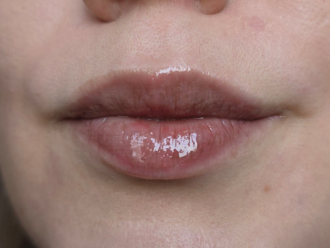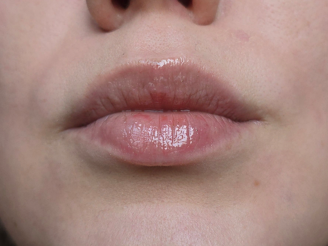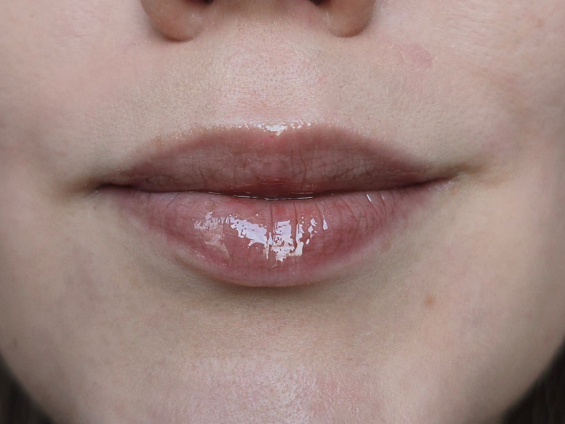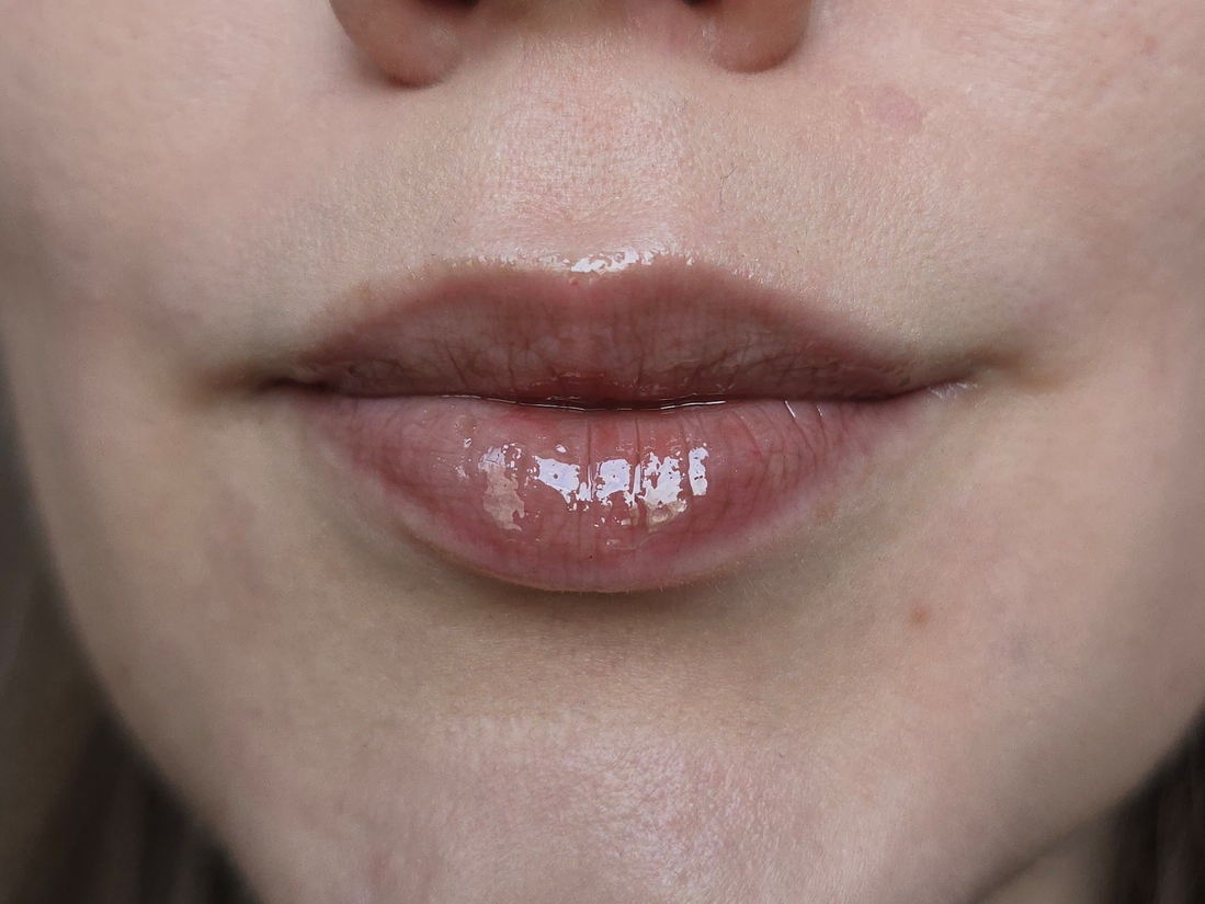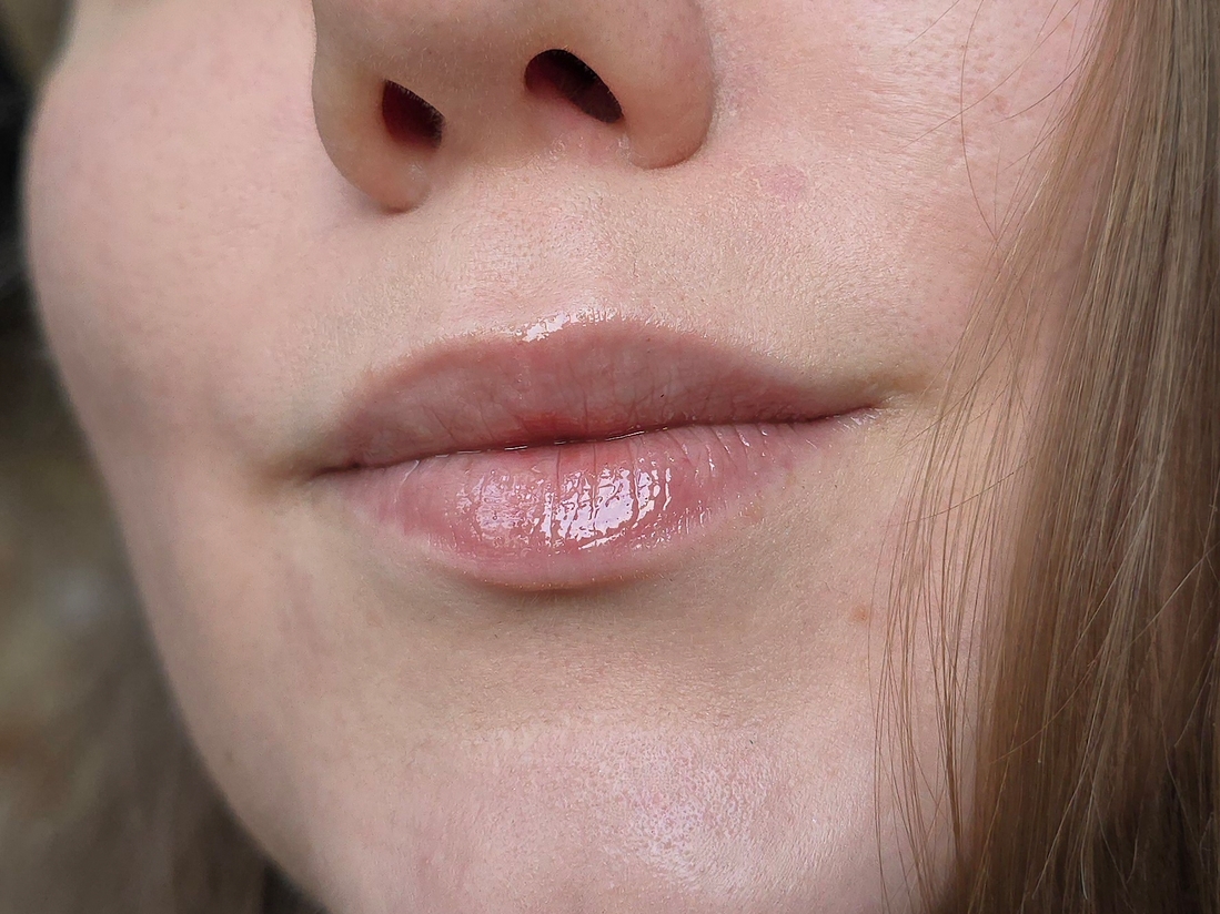 Добавила ещё. Насыщеннее цвет не стал, но губы уже кажутся слипающимися. При этом ощущение от блеска не жирное, он скорее жирноватый гель.