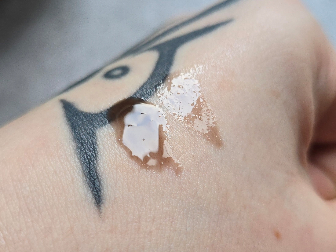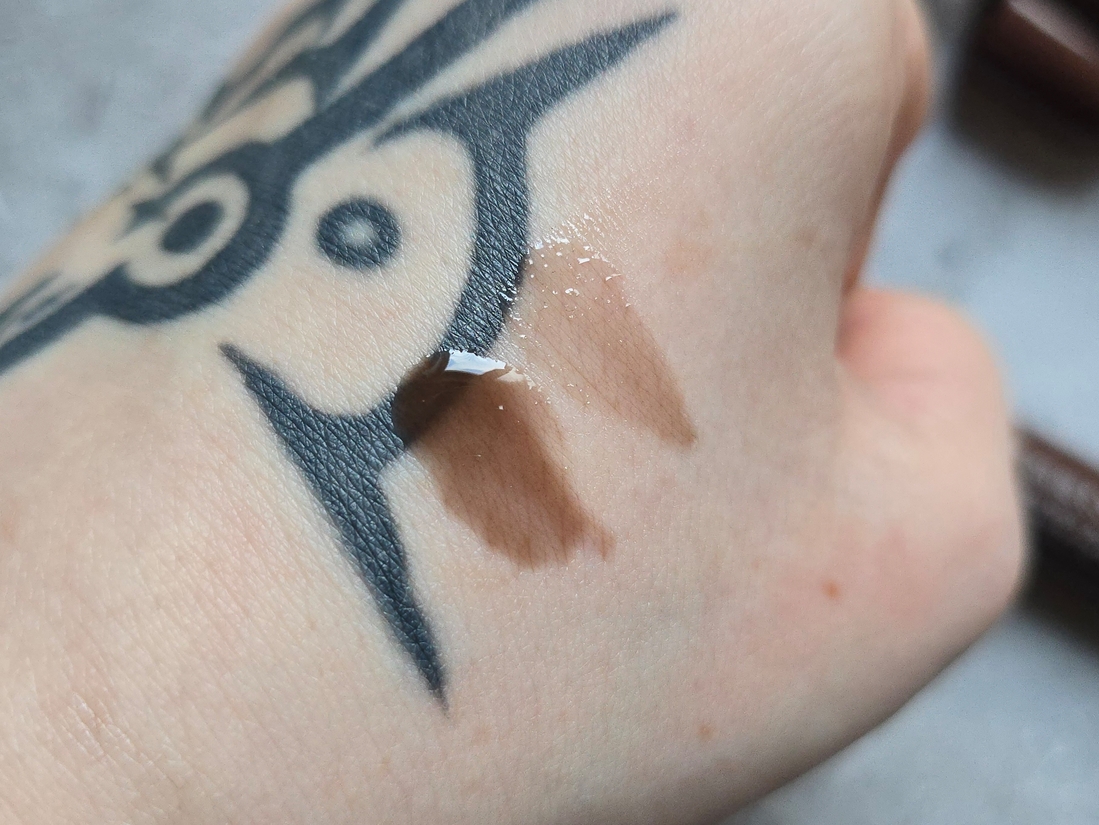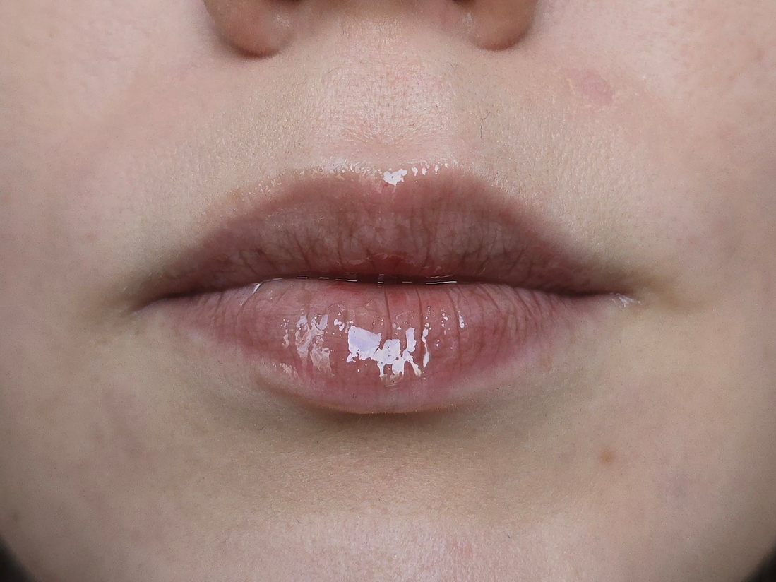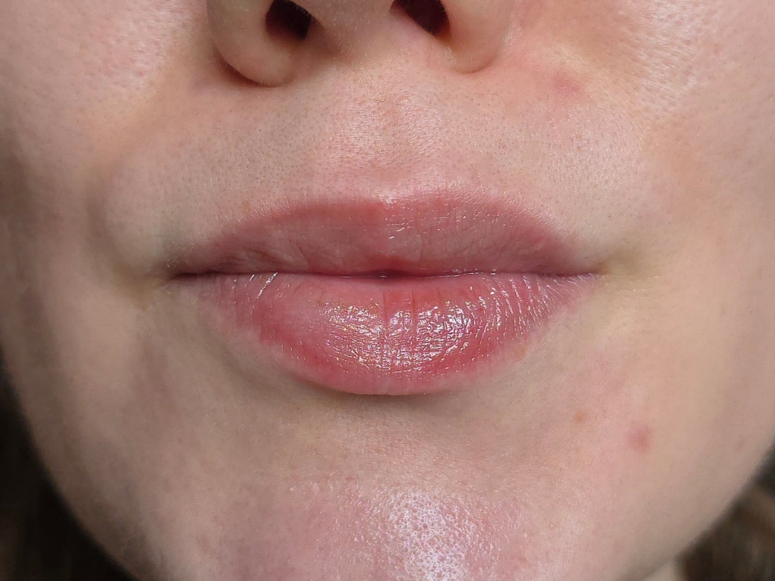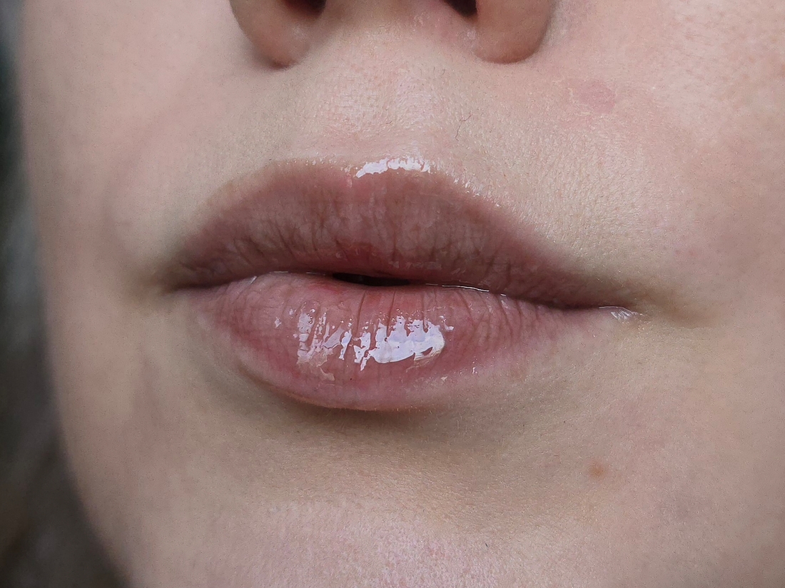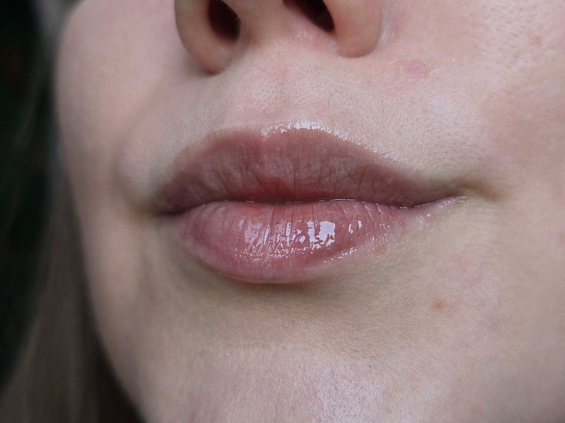 В небольшом количестве он вообще на губах не виден — тут я сняла на губы свотч с руки, не пропадать же добру. Губы выглядят влажными, но цвета нет.