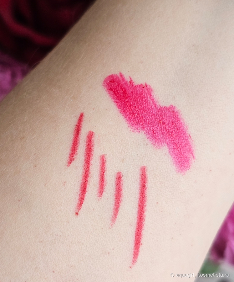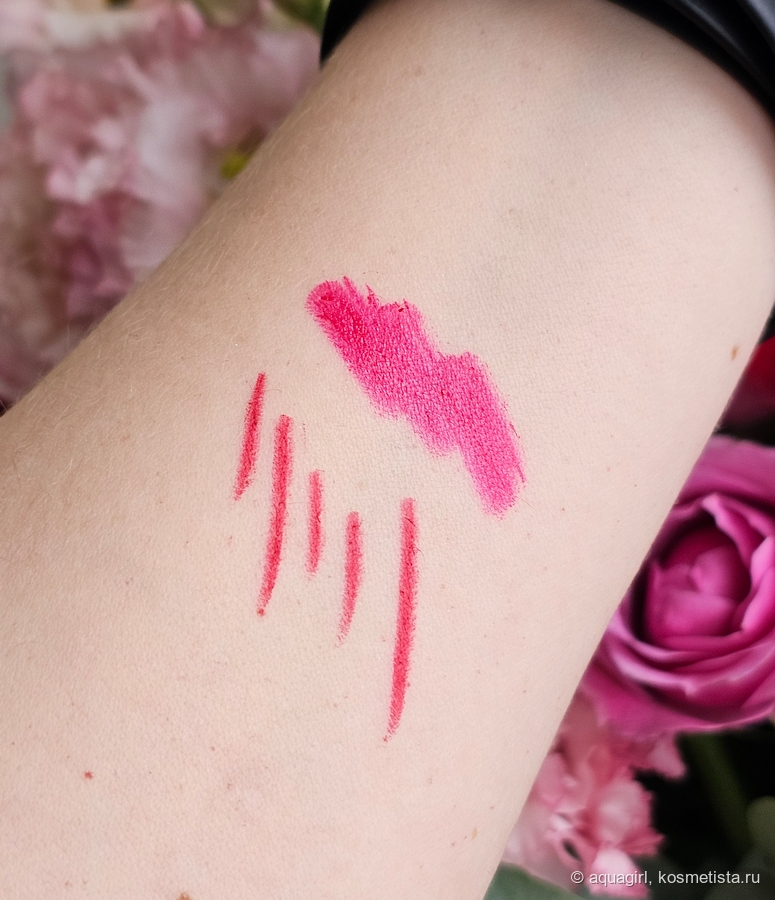 На свотче хорошо видно, что оттенки карандаша и помады значительно отличаются. Карандаш чуть темнее и уходит в вишнёвый подтон, помада яркая и сияющая. Это позволяет сделать макияж губ более объемным, не уходя в заметное омбре.