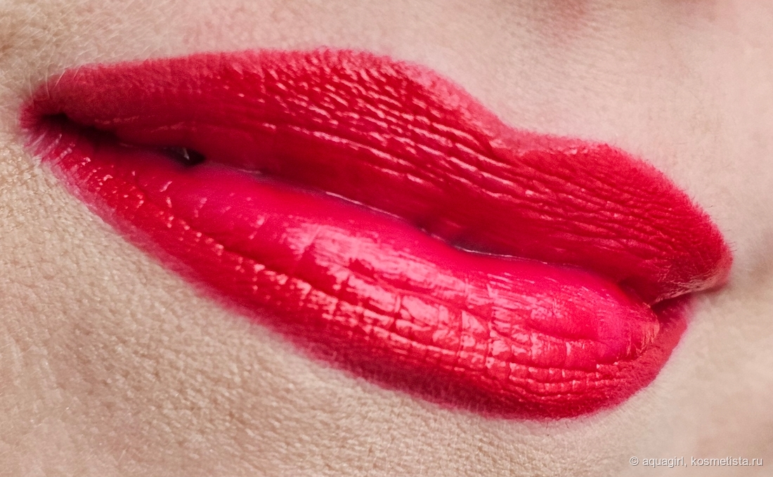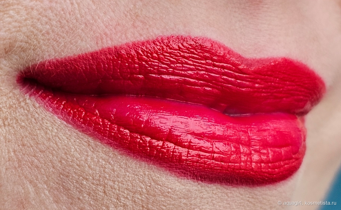 Помада в тонком стике, легко прорисовывает контур, который можно подправить карандашом. Текстура скорее гелевая, чем кремовая. Цвет ярко-красный с синим подтоном, финиш сияющий.