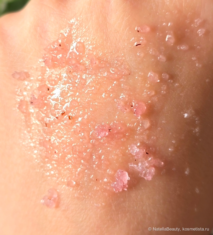 Текстура крупненькая, но пластичная. Здесь частицы сахара и морской соли с маслами. Масла поднимаются наверх, поэтому перед использованием я перемешиваю продукт.