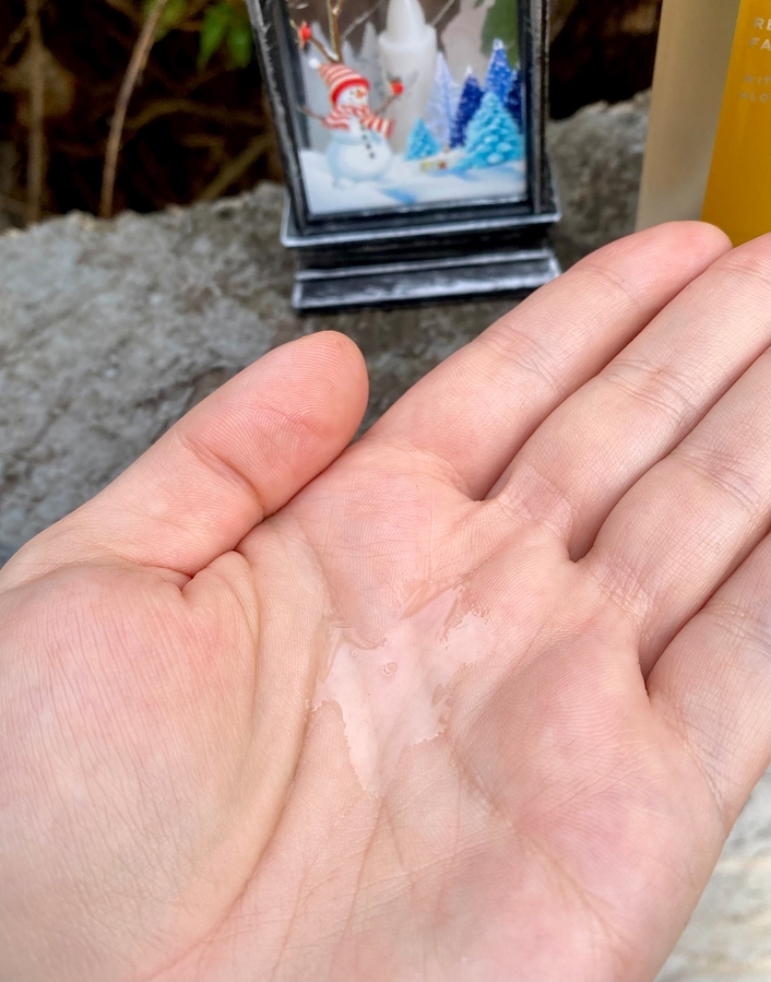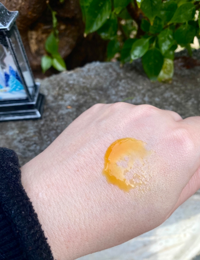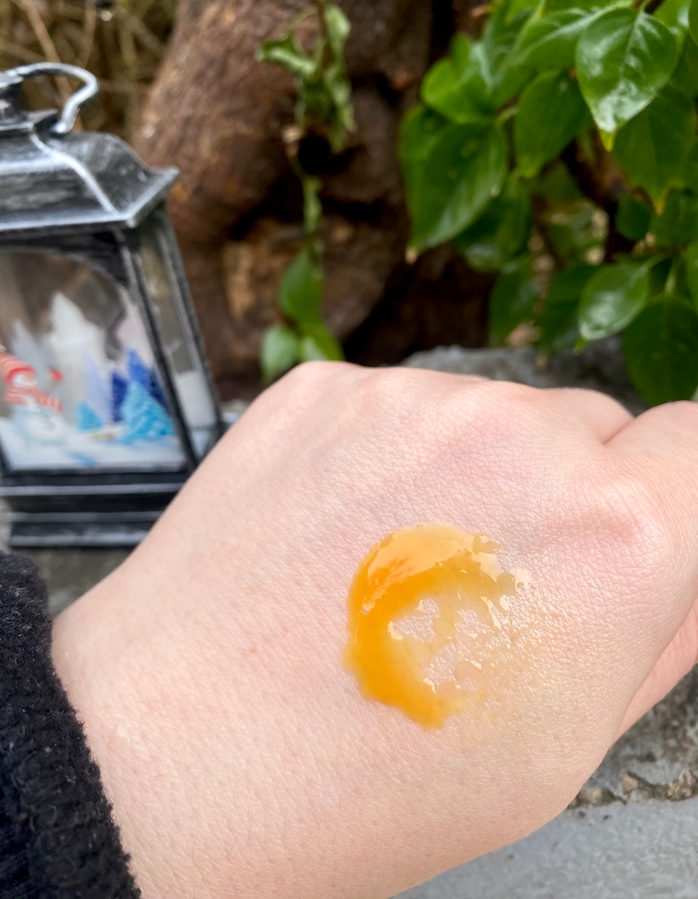 Цвет сыворотки, как вы видите, ярко-оранжевый. Совсем немного окрашивает лицо. Аромат — очень лёгкий, еле заметный, цитрусовый.