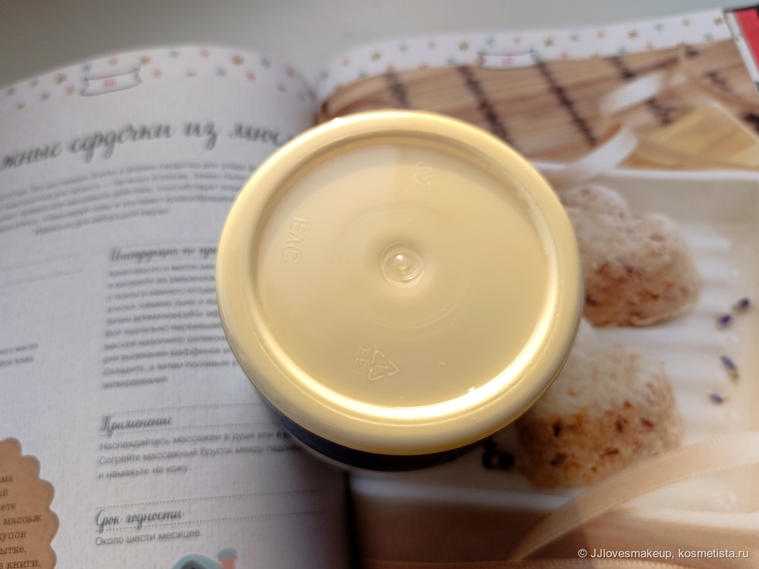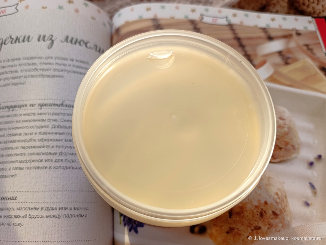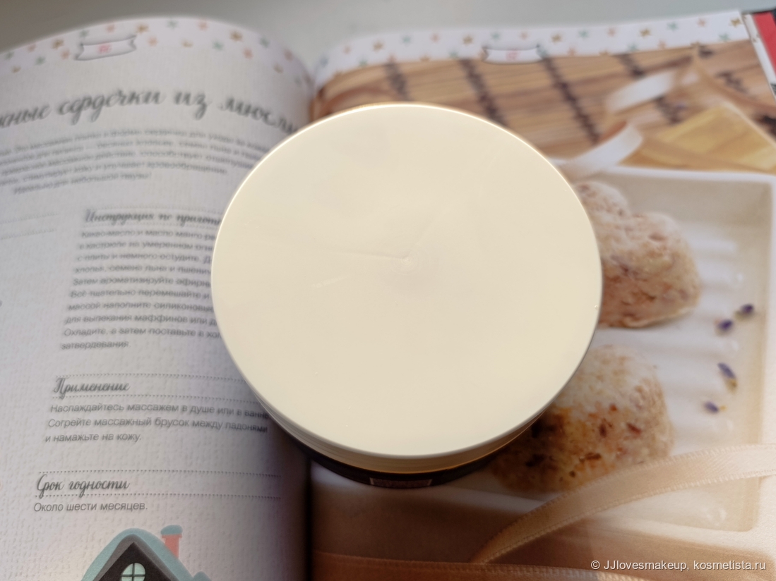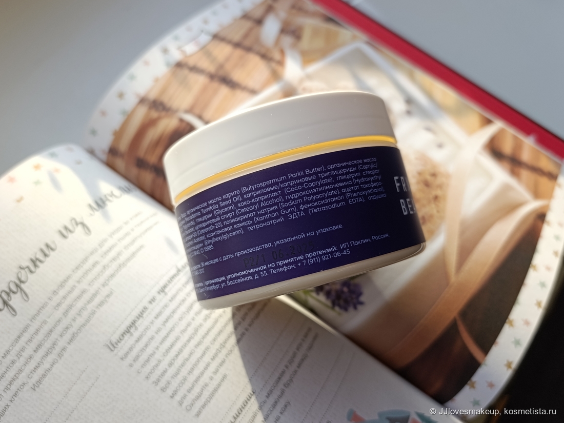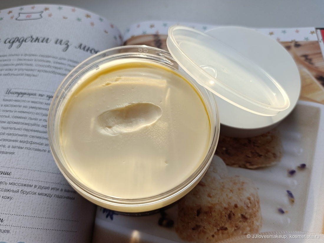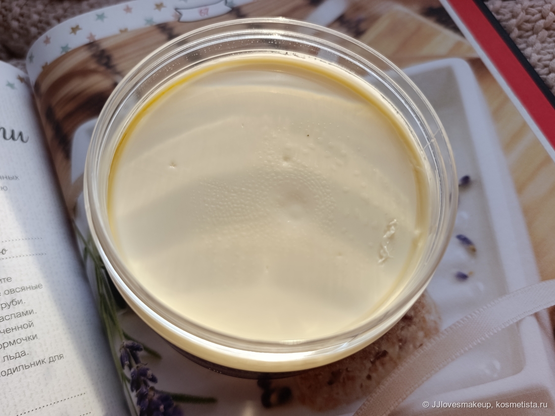 Что внутри: для меня это точно не баттер, так как никакой маслянистости в нём нет. Больше всего он похож на очень плотный, хорошо взбитый крем цвета топлёного молока, который при нанесении становится шелковистым, питательным и на удивление не тяжёлым. Средство плотное, на поверхности крема остаются следы от пальцев и вмятины, но оно весьма быстро тает под пальцами, за несколько минут полностью впитывается, питает кожу и не оставляет жирной плёнки или следов.