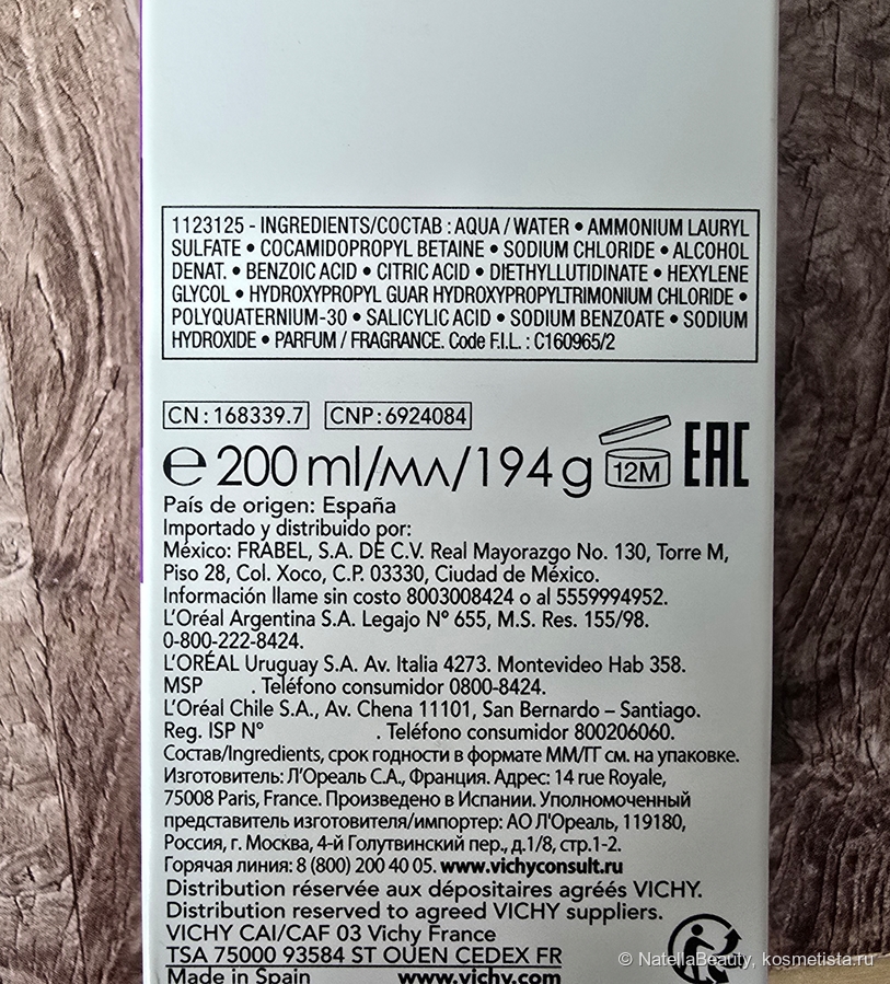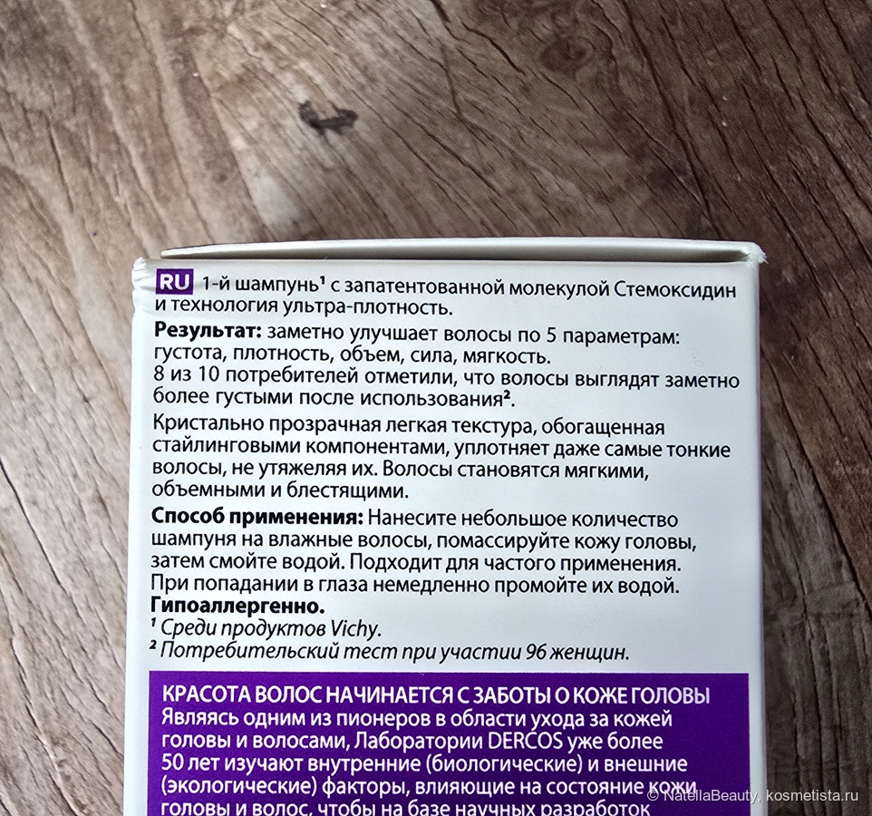 Шампунь содержит запатентованную молекулу стемоксидин (среди продуктов Vichy) и производитель обещает нам ультра-плотные волосы без утяжеления. Проще говоря, шампунь содержит стайлинговые компоненты.