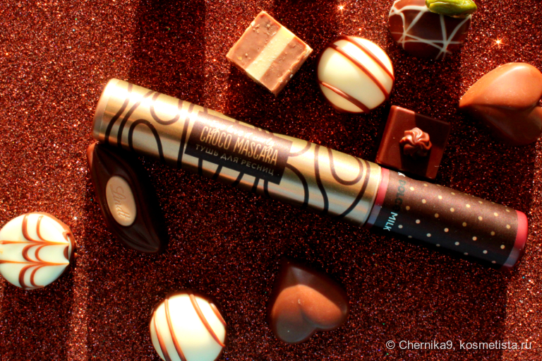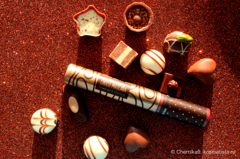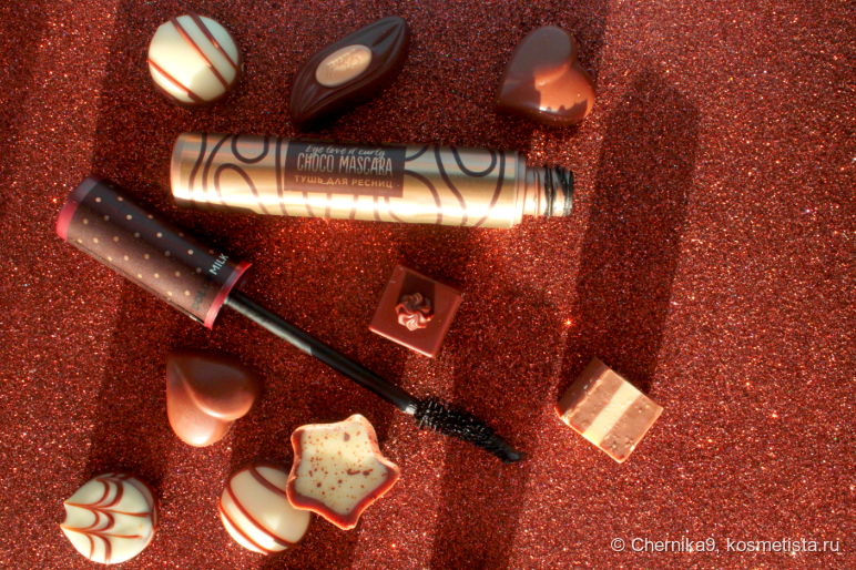 Дизайн тушей сделан в тематике шоколадных конфет. Обе они пахнут шоколадом, придают чёрный цвет ресницам, но у них разные щёточки: ёлочка и слегка изогнутая еловая веточка. Первая обещает объём и удлинение, вторая — объём и покручивание. Я выбрала второй вариант.