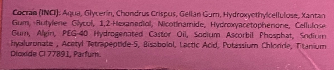 - Гиалуронат натрия и Acetyl Tetrapeptide-5 обеспечивают интенсивное увлажнение, разглаживание мелких морщин и мягкий лифтинг эффект.