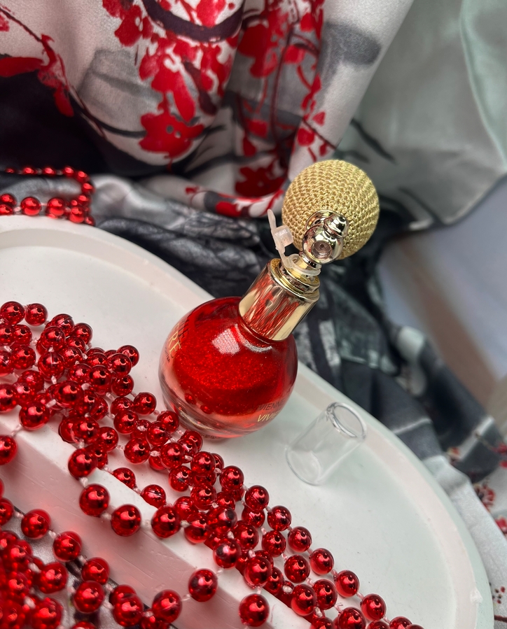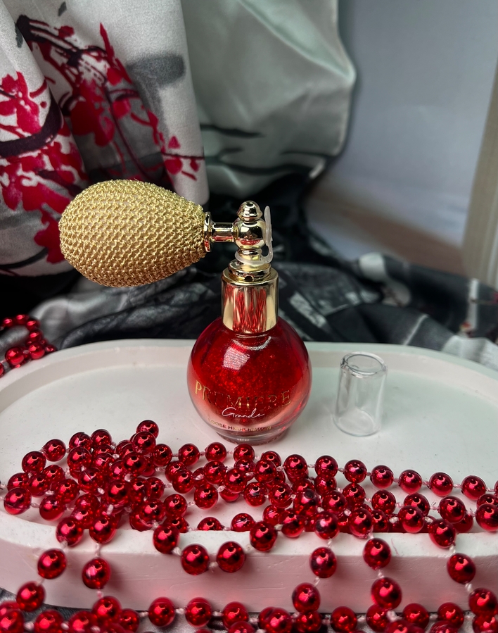 Изящный круглый флакон, выполненный из стекла с плавным переходом цвета от прозрачного к насыщенному красному, декорирован утонченными золотыми надписями. Его главное украшение —аутентичный пульверизатор-груша, добавляющий изделию винтажного изыска.