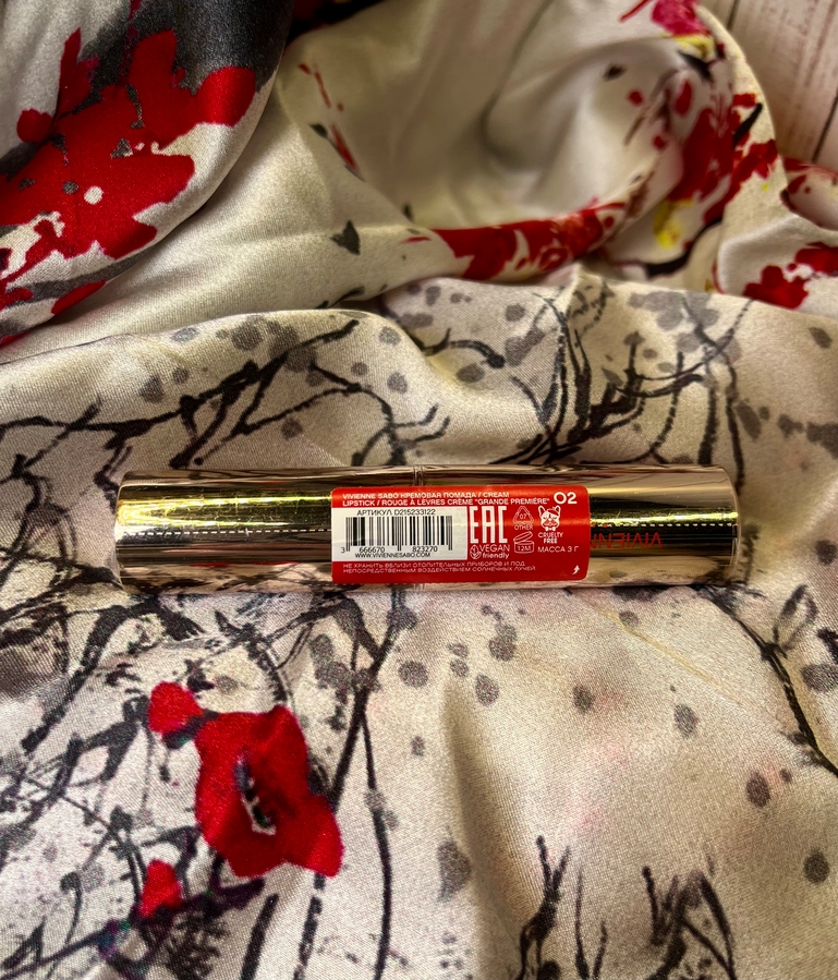 Второй продукт из коллекции — кремовая помада Vivienne Sabo Premiere grande. Она представлена в двух оттенках: нюдовом и мерцающем красном. Я выбрала оттенок 02 beige, так как в макияже губ предпочитаю подобные нежные тона.
