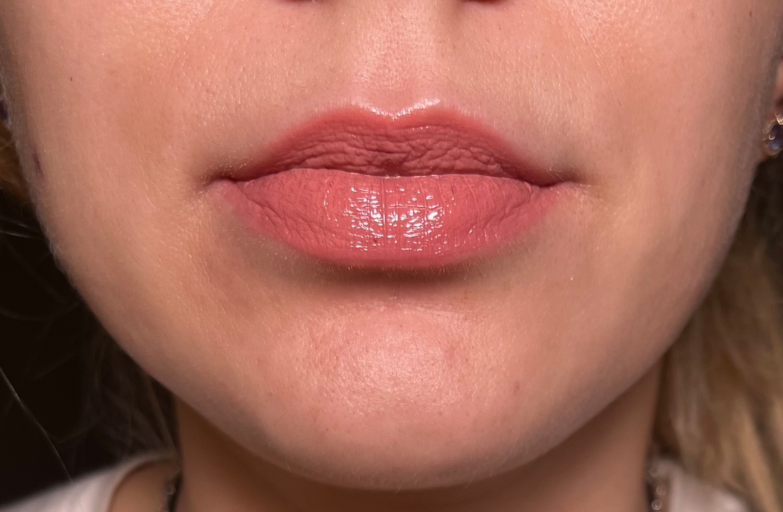 Помада обладает тающей, сливочной текстурой, которая обеспечивает невероятно мягкое нанесение. Аромат легкий, косметический, после нанесения не ощущается. Оттенок имеет теплый подтон.