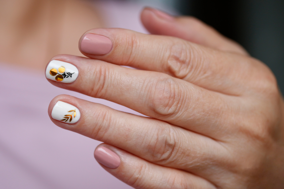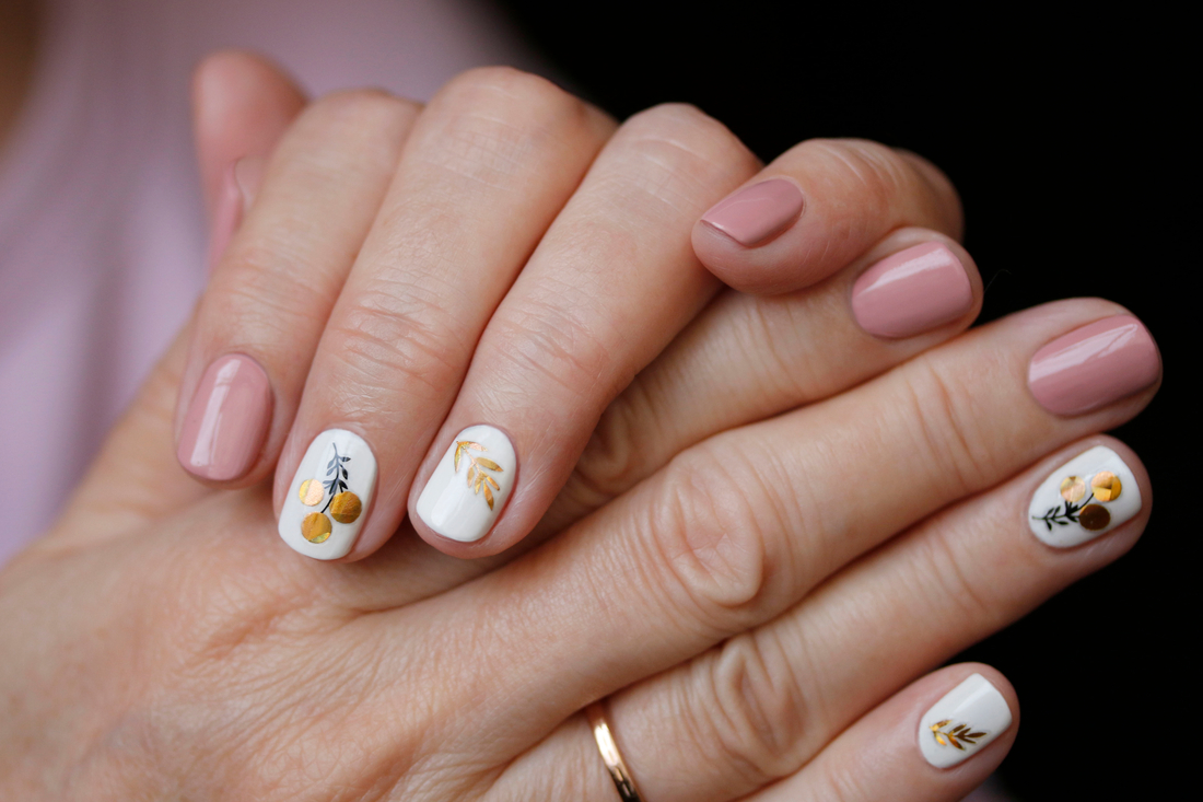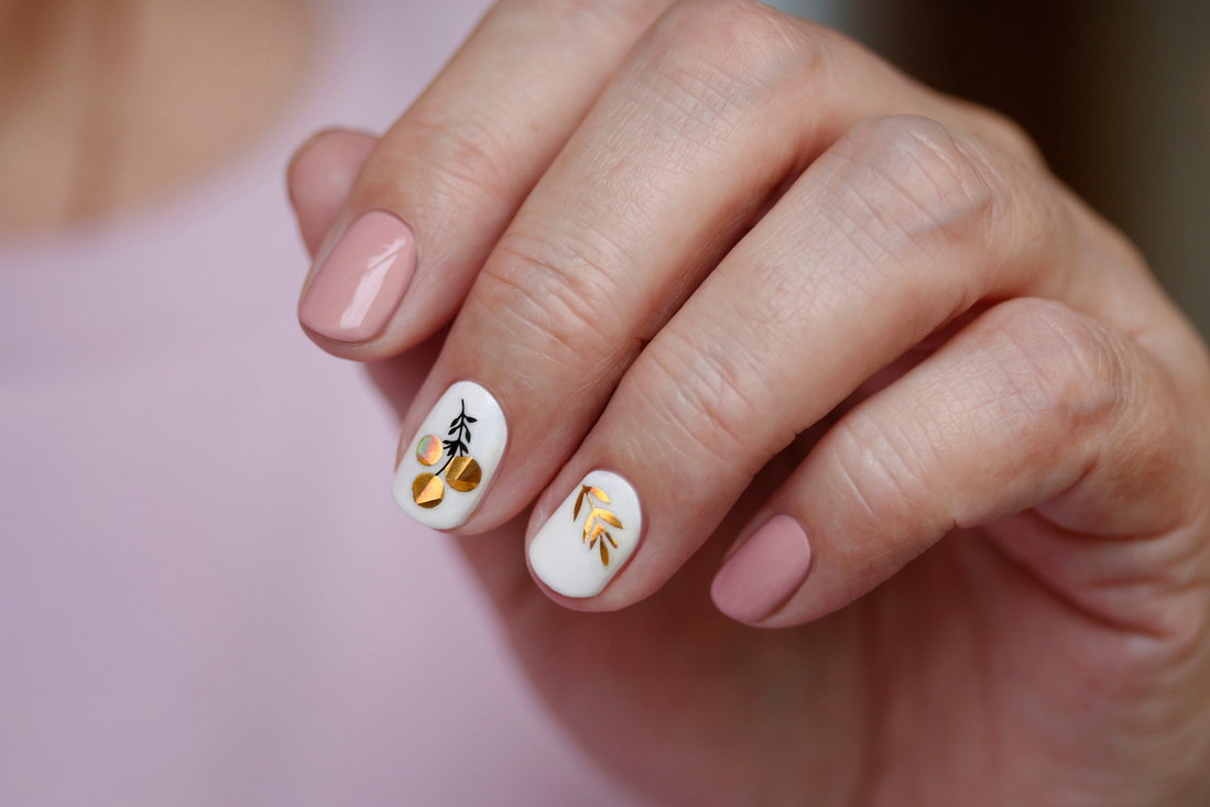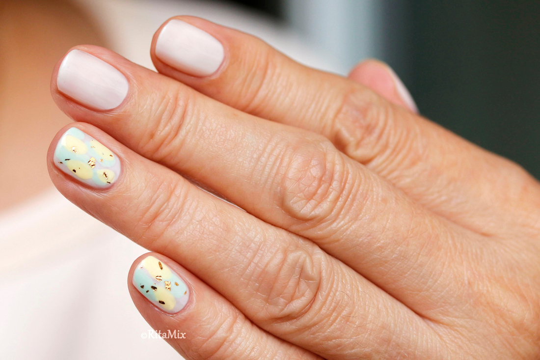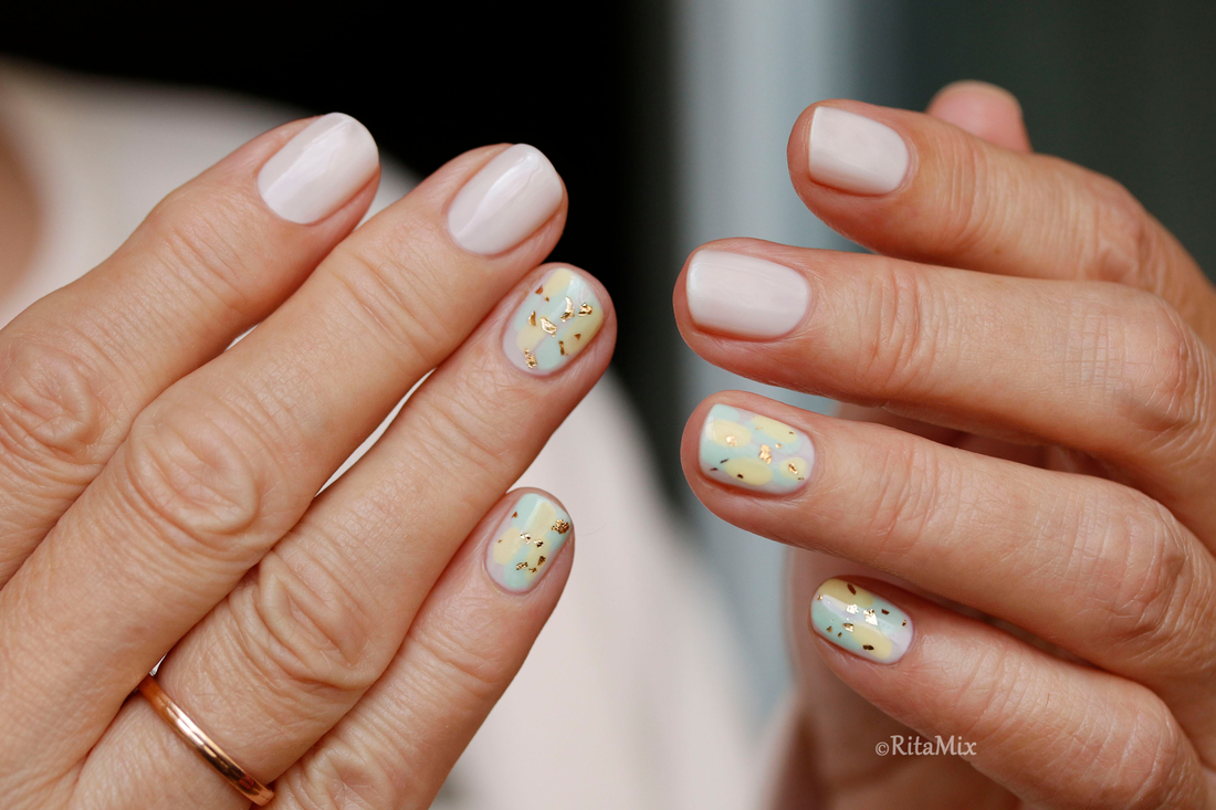 Покажу вам один из своих маникюров, в котором декор выполнен с помощью пастельных лаков и кусочков золотой потали. «Кружево» наносила в два плотных слоя.