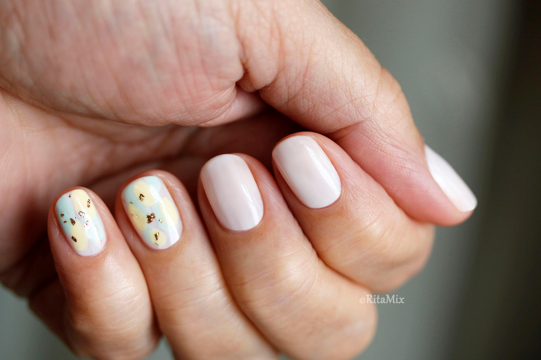 Для маникюра, а я добивалась акварельного эффекта, лак нанесла в два обычных слоя и покрыла сушкой.