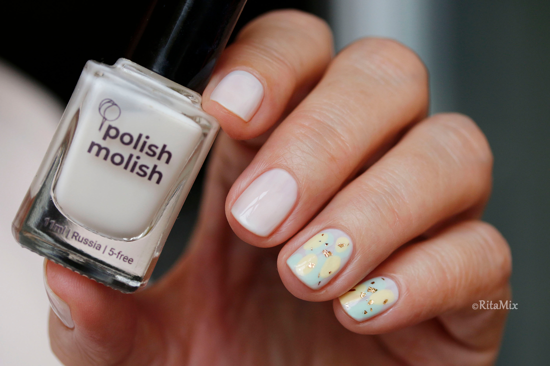 Надо сказать, что это тоже камуфляжная база, но и как самостоятельное покрытие имеет место быть. По текстуре желе со средней пигментацией. В целом очень похож на Pastel # 03, но плотнее по текстуре, поэтому Pastel послушнее и приятнее в работе. А еще у Polish Molish отвратительная кисть. Она не просто неудобная по форме, с этим еще можно мириться, но и очень короткая, а это уже никуда не годится. Естественно, что с такой кистью лак при нанесении полосит и плешивит, поэтому приходится изощряться, чтобы лег ровно. Я чаще использую его по назначению — в качестве базы, хотя и маникюр могу замутить.