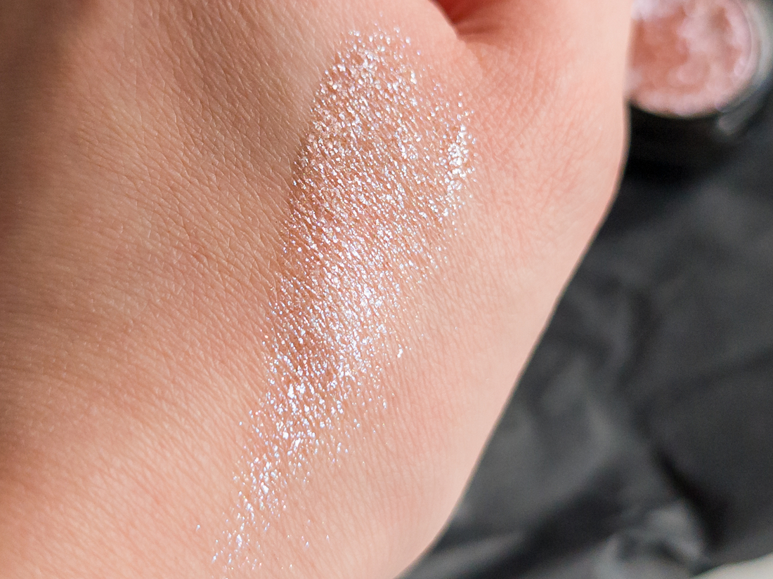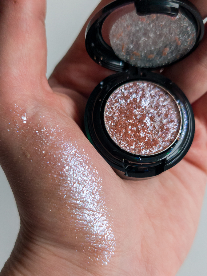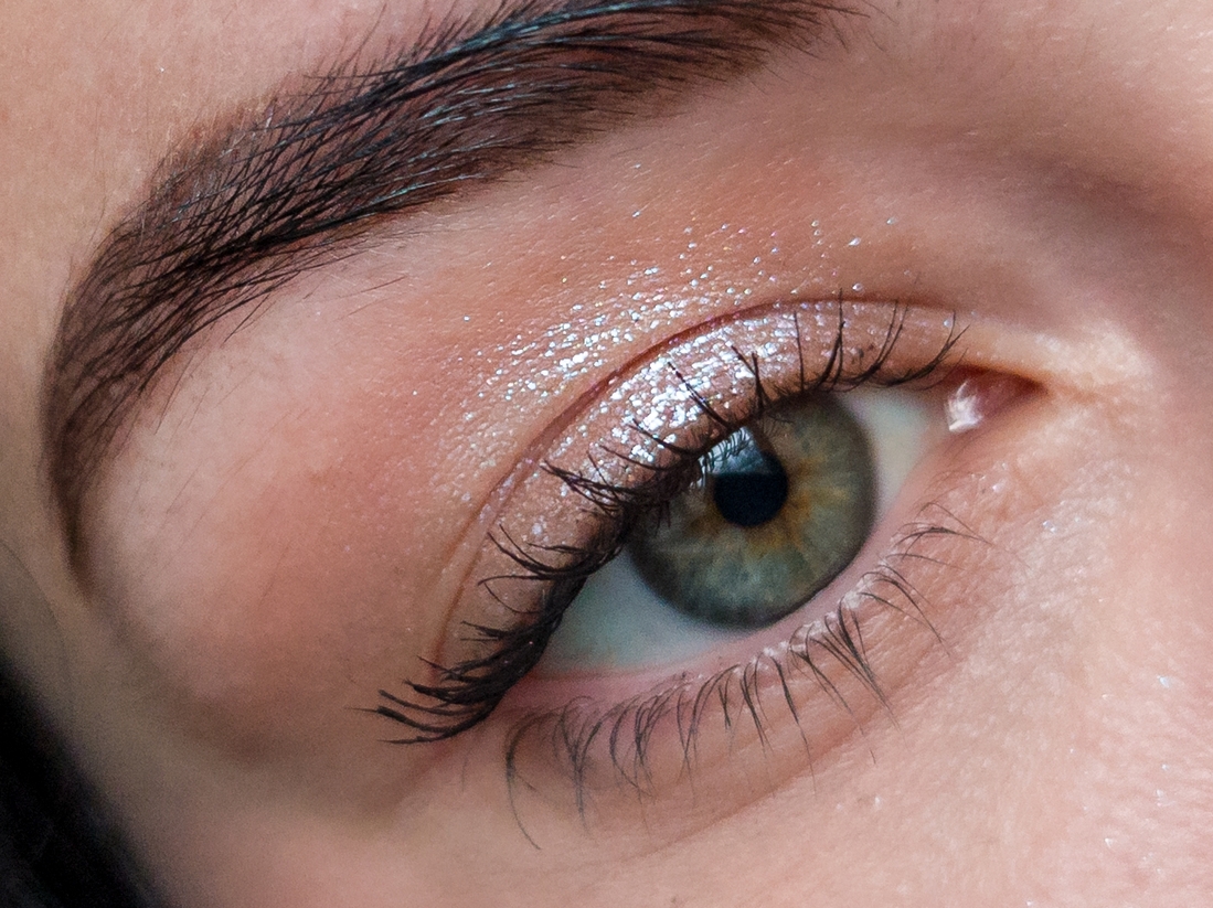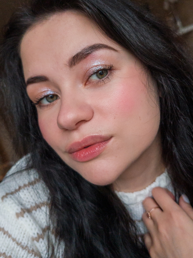Так выглядит спаркл, нанесённые на абсолютно голое веко. Цвета не видно совсем, есть просто влажный, серебристо-голубоватый блик в центре века. Морозно, не ярко, но как будто чего-то не хватает.