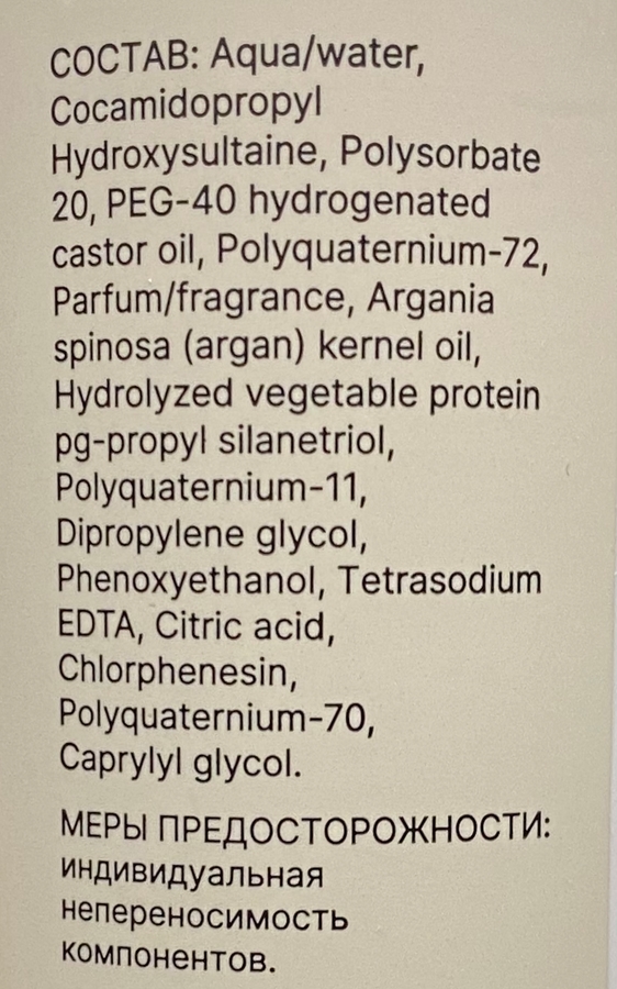 Здесь в составе есть силикон, тот самый «вшитый» силикон с гидролизованным растительным протеином, знакомый многим по средствам SM. Но что здесь должно фиксировать — для меня загадка, а вот увлажняющих и сглаживающих ингредиентов много.