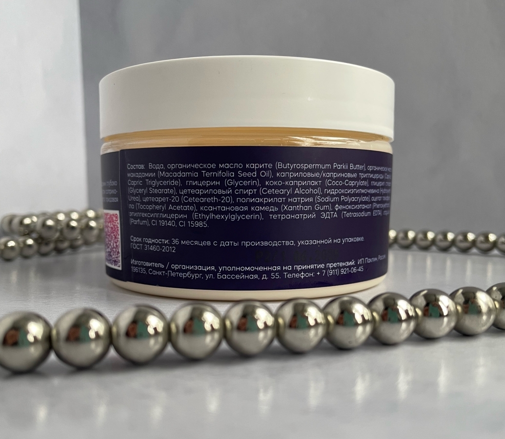 Активные ингредиенты: масло карите (питает кожу), масло макадамии (устраняет сухость), глицерин и мочевина ( увлажняют кожу), витамин Е ( увлажняет, питает, придаёт упругость).