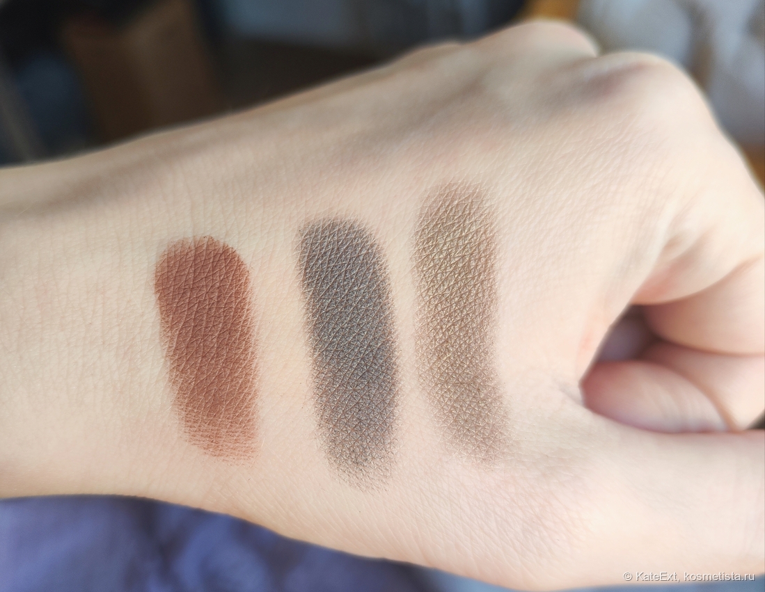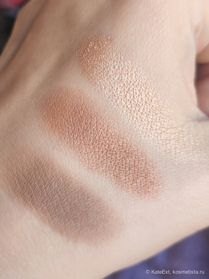 Матовые же в палетке разные — один сухой, второй очень сухой, третий — самая сухая субстанция, к которой я когда-либо прикасалась. Серьезно, я поначалу даже с кистью боялась к ним подходить, но, и это удивительно, пыли почти нет. Тушуются тени тоже безпроблемно, но если взять на кисть больше необходимого, то напятнить все же можно.