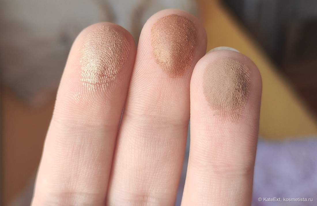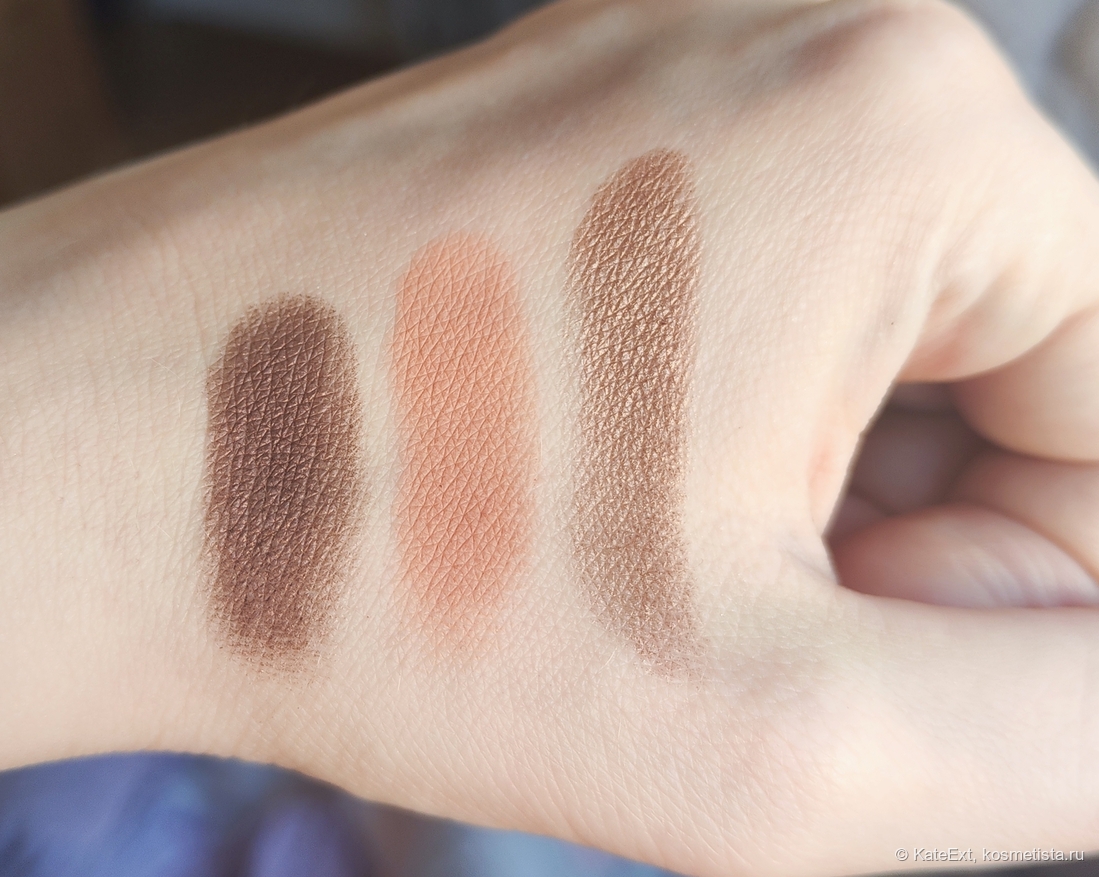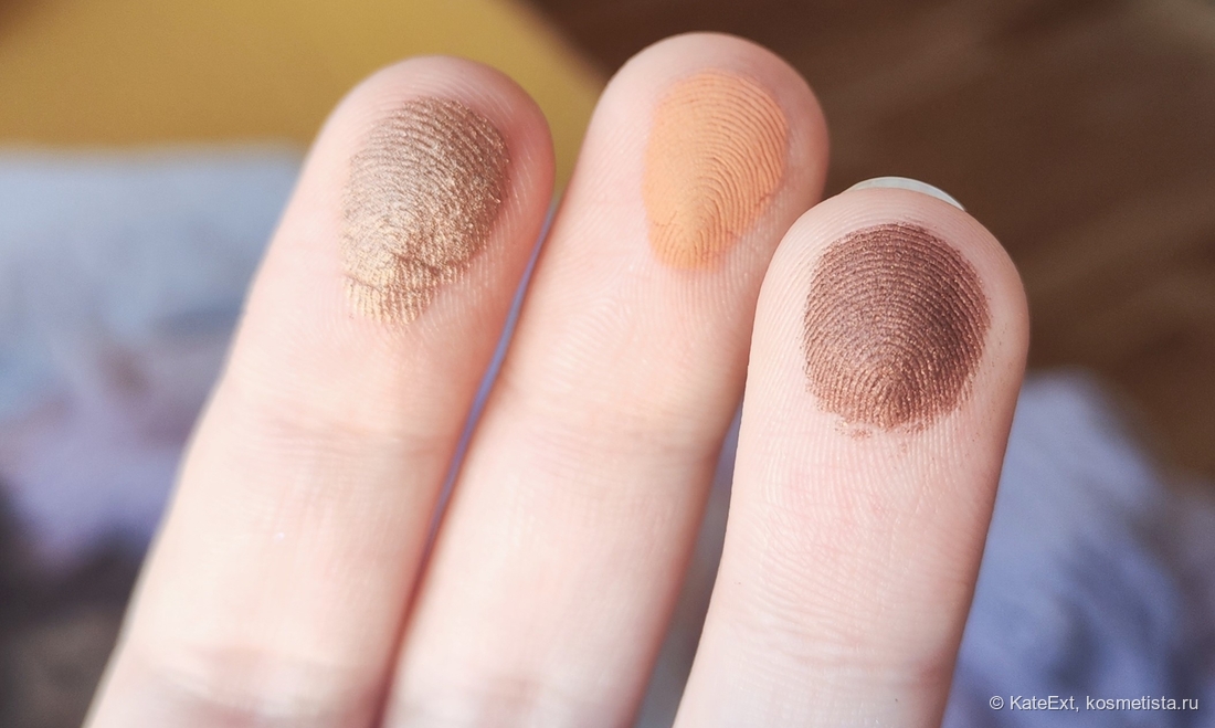 Ну и давайте переходить к оттенкам. Названий у них нет, но на официальном промо бренд называл их по ряду (A, B, C) и по положению слева направо (1, 2, 3), так что и я буду так же — прошу прощения, но так проще, чем придумывать названия рыжим и коричневым.