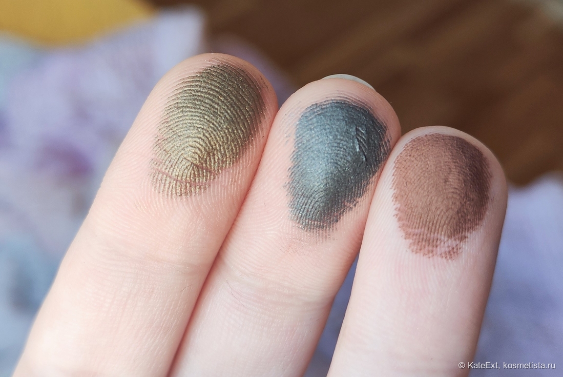 Рефиллы представлены в двух вариантах: матовые (три штуки) и сатины, которые сам производитель именует металликами (семь, соответственно), и вот сатины обалденные: мягкие, шелковистые на ощупь, не пылят, отлично переносятся на глаза и тушуются, единственное — синеватый может осыпаться, но по минимуму.