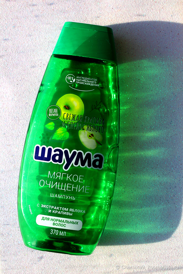 Итак, знакомьтесь. Версия для России легендарной Шаумы 90-х. Обещает мягкое очищение и подходит для нормальных волос. Формула веганская, содержит 90% компонентов натурального происхождения. Продаётся в красивом зелёном флаконе с аппетитным яблочком и листиками крапивы.