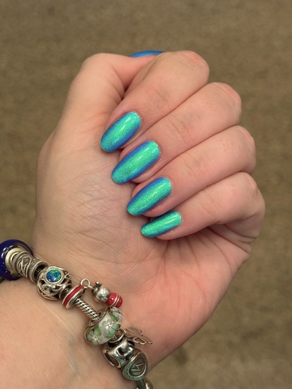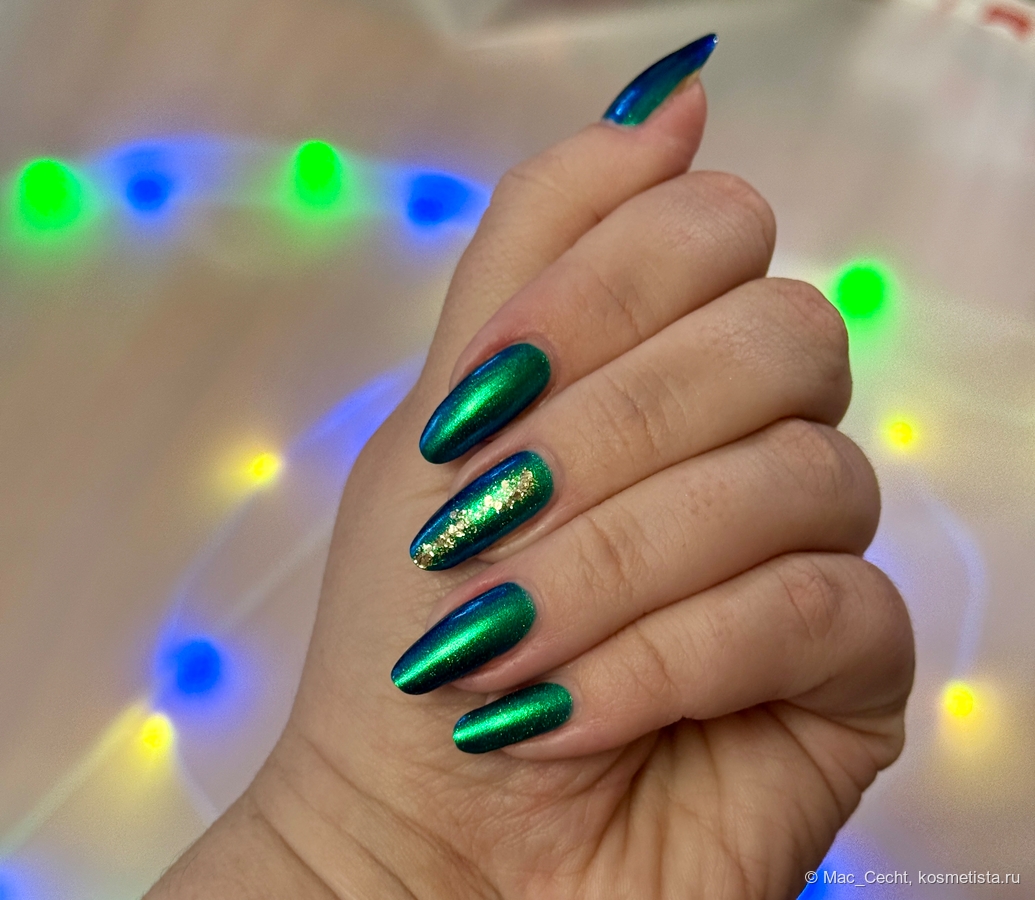 Я хотела пообещать скорый обзор на этот лак, потому что он богаче, чем на этом кадре, переливается из бирюзы в изумруд, но во время съемки случилось это. Так что будьте осторожнее. Я испортила маникюр, чехол для телефона и пододеяльник. И надеюсь, что с остальных флаконов все ототрется.