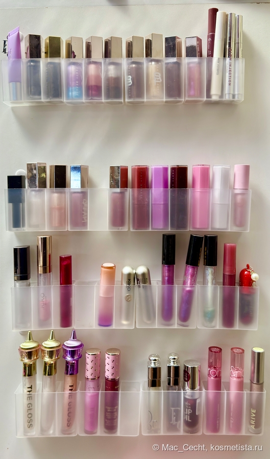 Самое полезное приобретение 2025 — Настенный органайзер для помад. Я писала о них пост, но с того момента здорово расширилась — не выдержала и добавила себе еще одну линейку, теперь у меня на стенде сразу 48 ячеек, а запихнуть в них можно чуть больше.