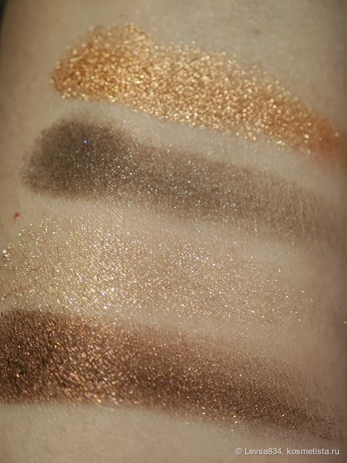 По характеристикам спаркл это послушный продукт, чуть суховат, наносится и кистями, и пальцем. Не осыпается в макияже, стойкий. Очень нарядный. Правда, палетку изрядно украшает своими частицами, при использовании она выглядит так: