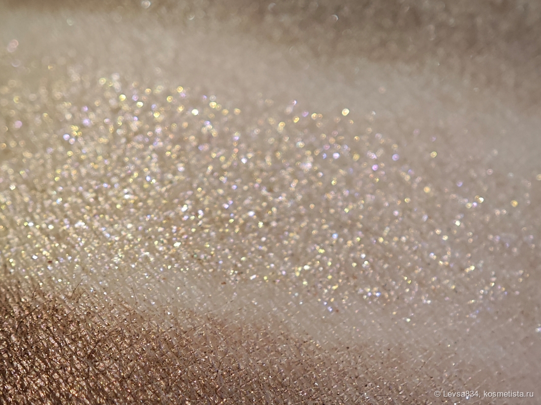 2 оттенок это вторая моя любовь в палетке, это спаркл. Не рыхлый, не крупный, без хлопьев. Чуть шершавый. Он состоит из отдельных частиц одинакового размера, общая база которых едва ли имеет цвет и лишь намекает то на бежево-золотой, то на хрустально-серебрянный, но в ней, этой базе, постоянно вспыхивают золотые, розовые и сиреневые искры, и они-то моментально завораживают меня.