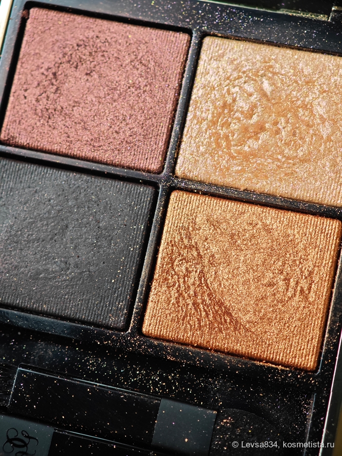 Я собиралась покупать другую, зелёную, которую все очень хвалят. Я даже подержала ее в руках и сделала свотчи. На свотчах поняла, что оттенки сильно напоминают гамму палетки Yucca Natasha Denona, которая у меня есть, но я была бы и не против дублей, такие цвета мне идут, я их люблю, но мне не понравилось то, что в четвёрке Guerlain не оказалось ни одного спаркла, только скромные металлики, похожие на сатины.
