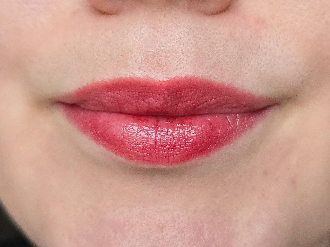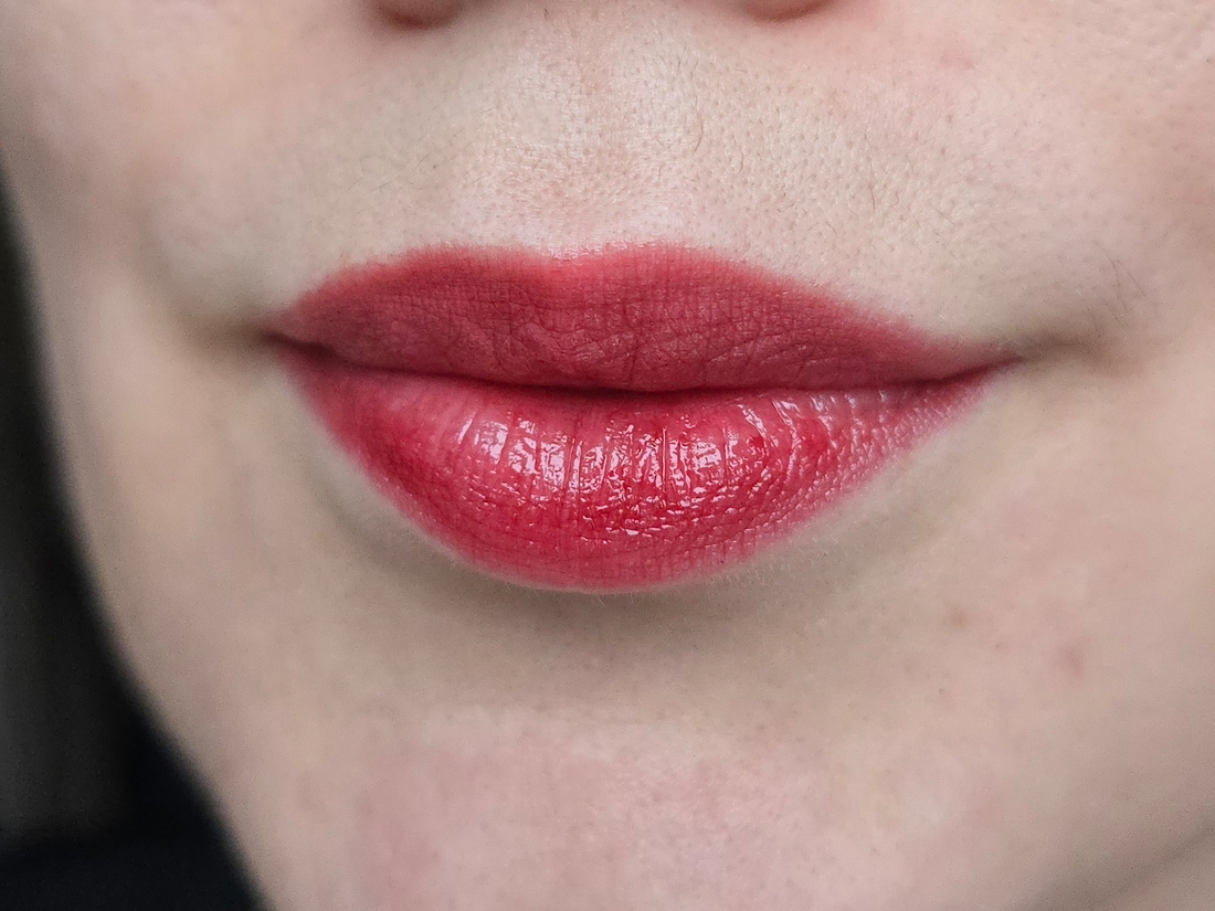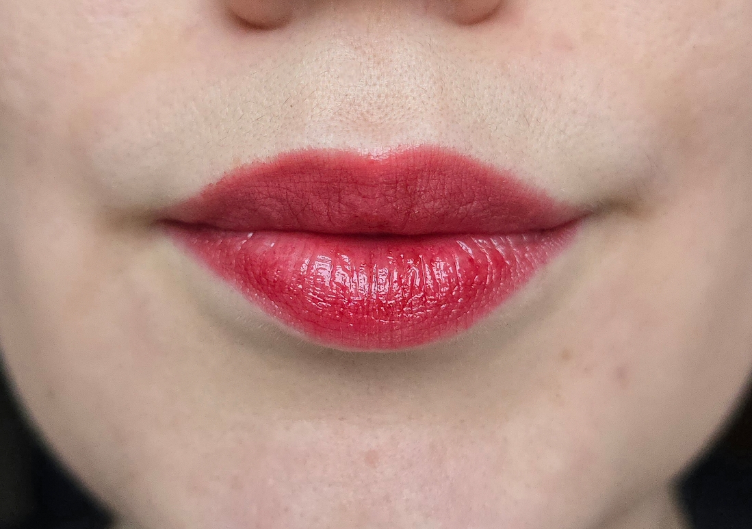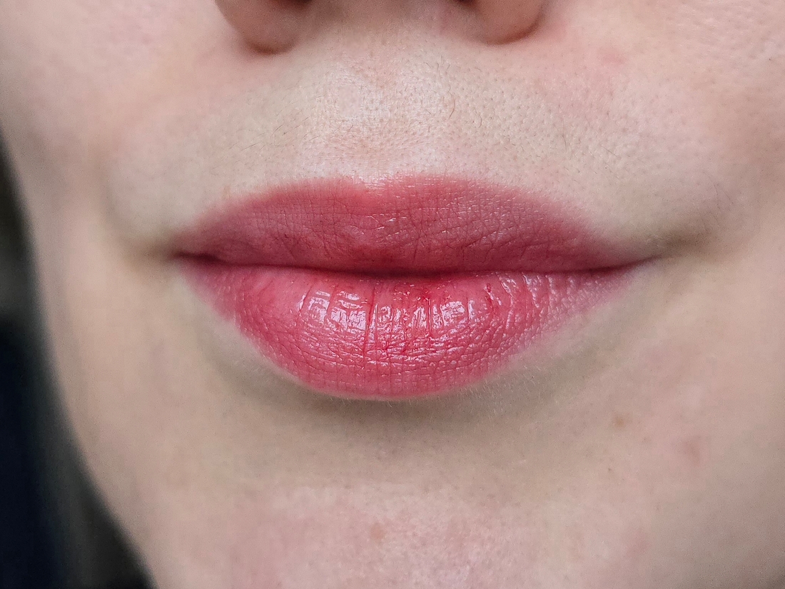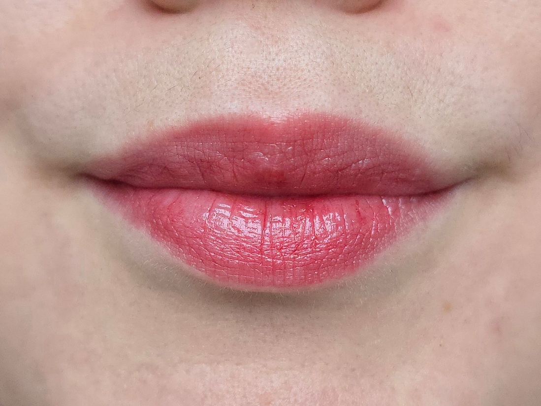 Бальзам в малом количестве, конечно, цепляется за шелушинки и сухие участки губ, но в целом распределяется хорошо. Издалека подкрашенных шелушинок не видно, видно только яркие губы с естественным рельефом.