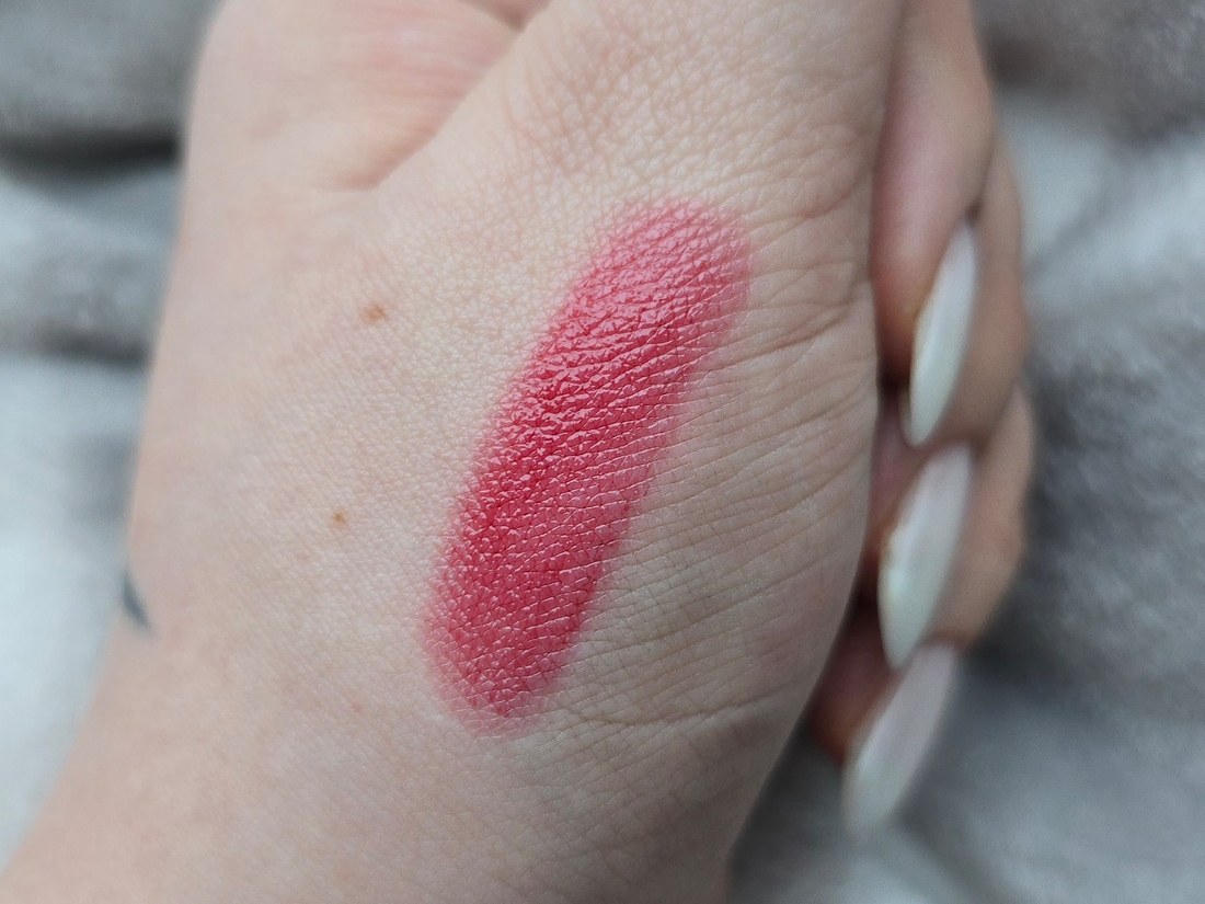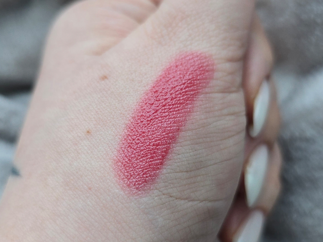 Холодным оттенок не назову, прохладный средний красный, на свотче слой средней плотности. Примеси бежевого или розового в основе нет, поэтому нет эффекта замазки.