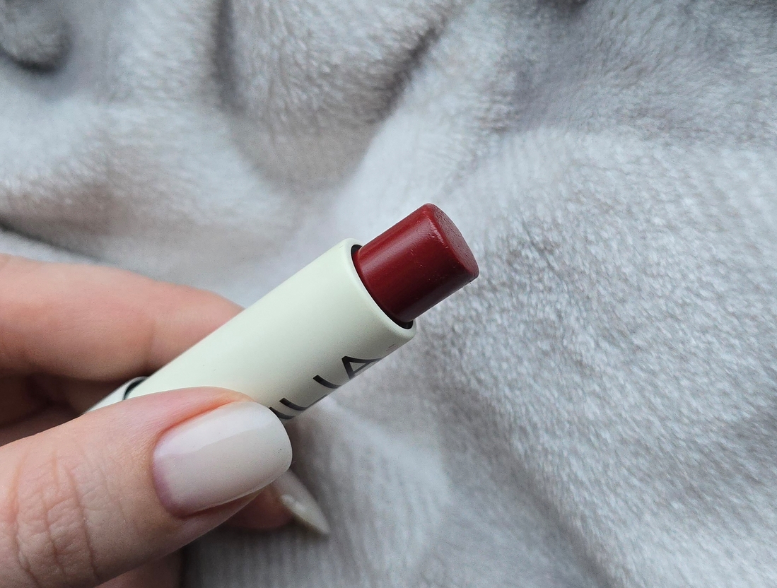 Если мы представим сейчас, что у нас есть шкала финишей средств для губ (абсолютно матовый — матовый — вельветовый — сатиновый — сияющий — глянцевый — стекло), то ILIA Balmy tint будет точно в середине: он отражает свет, но почти не блестит сам по себе.