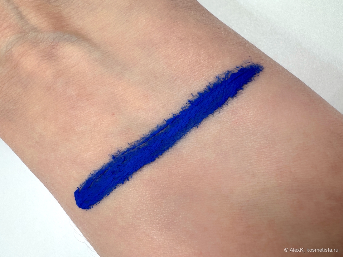 Ярко-синий электрик. Слегка разбеленный и более прохладный, чем классический ультрамарин. Как я понимаю, вся «соль» именно в диоксиде титана. Он создает подложку, благодаря которой цвет становится плотным и укрывистым. Даже после высыхания оттенок не меняется, а цвет собственных ресниц не проступает сквозь краску — ресницы остаются такими же яркими, как на свотчах.