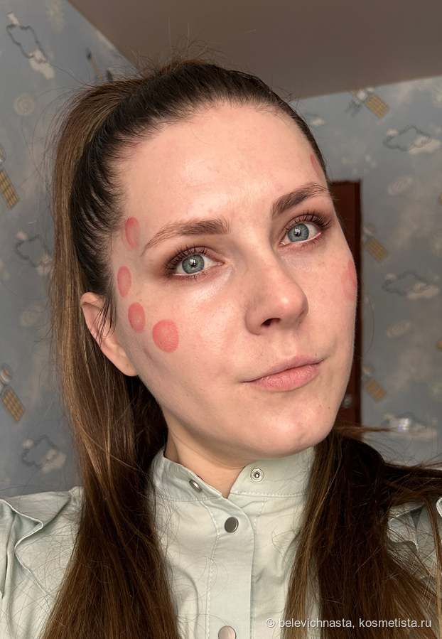 Румяна при таком способе тушевки хорошо ложатся на кожу тонким слоем, не тянут за собой базу и тон. Не пятнят и оттенок на моей коже выглядит довольно естественно и освежающе)